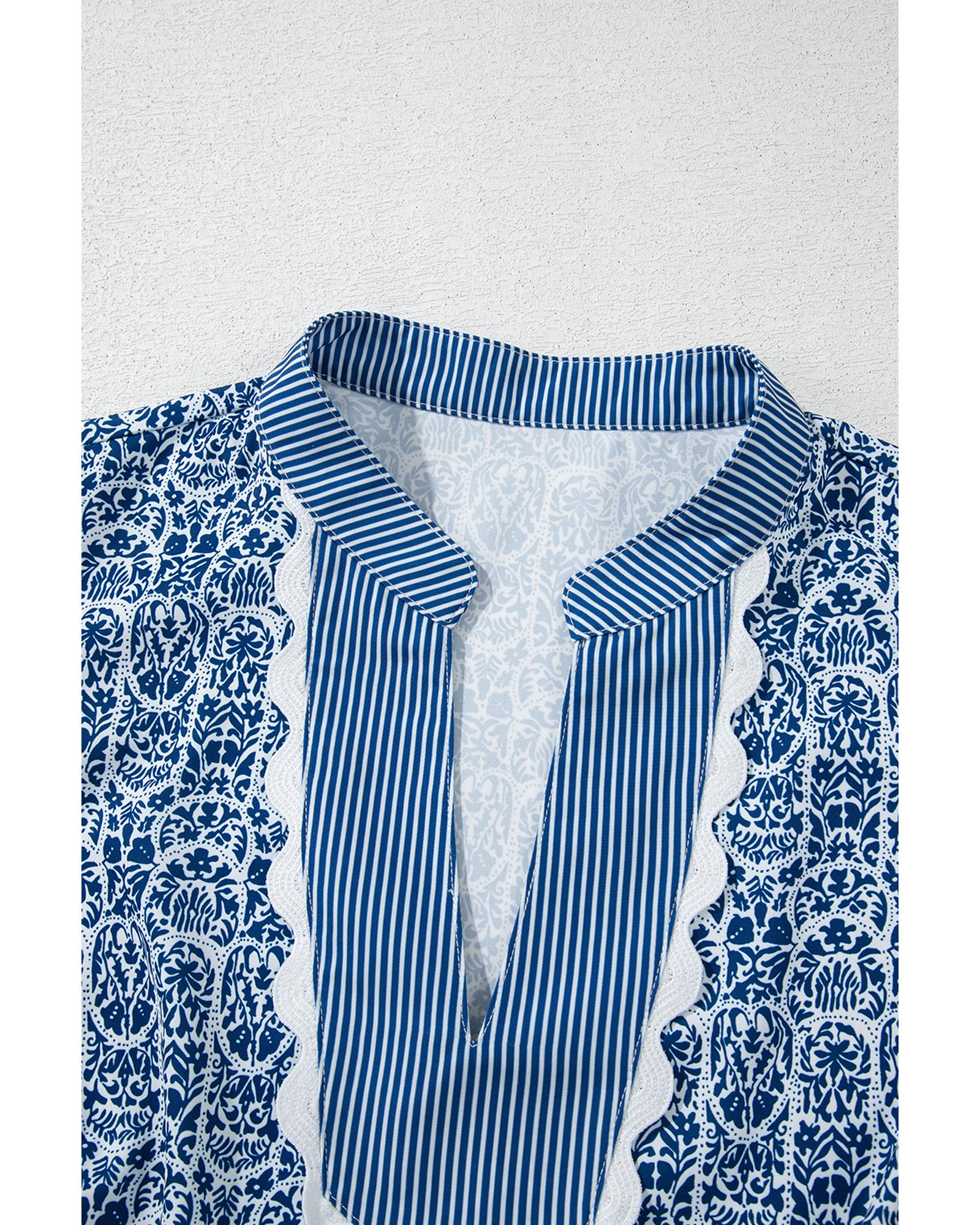 Blue Floral Striped Print Contrast Ric-rac Puff Sleeve Top – XL