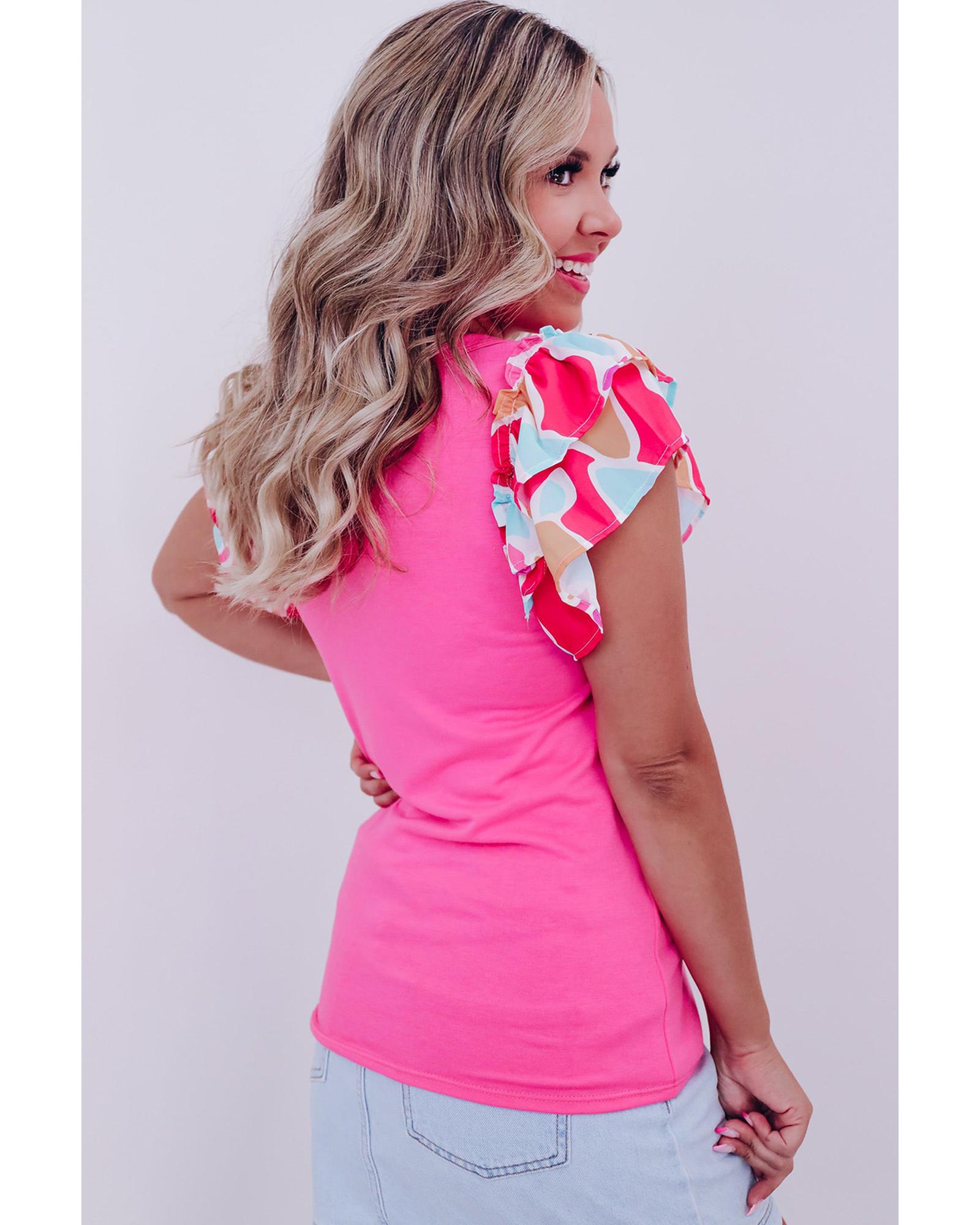 Bonbon V Neck Printed Ruffle Sleeve Patchwork T-shirt – S