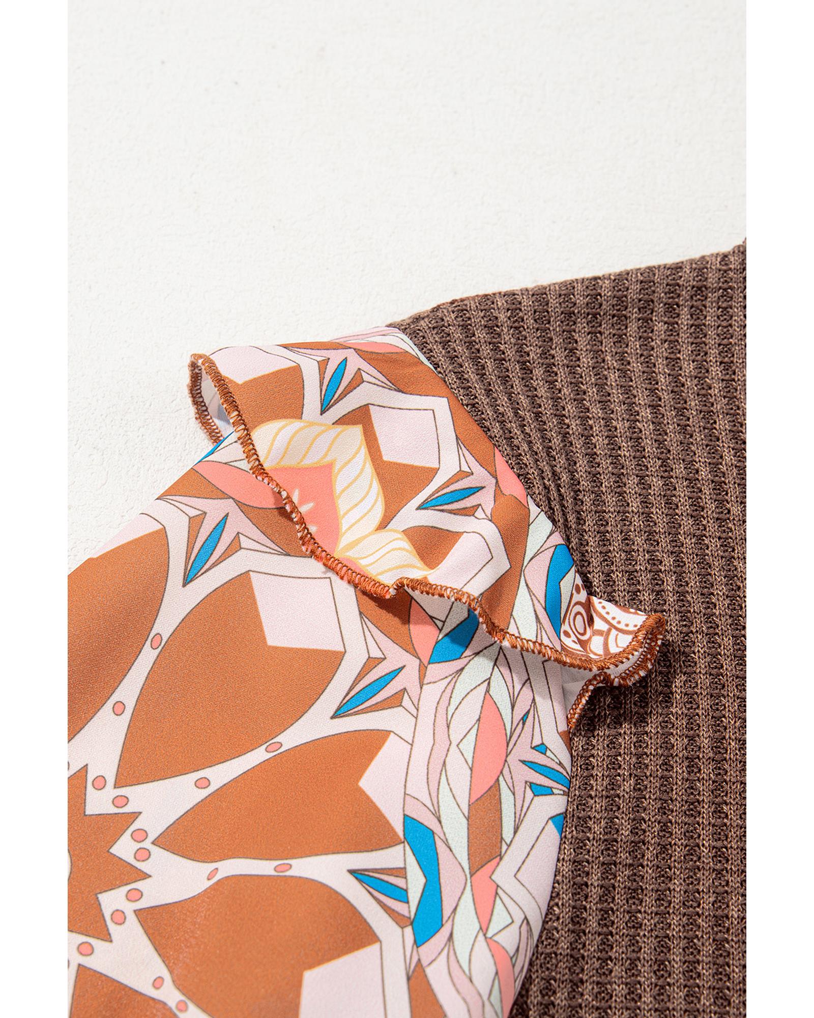 Coffee Ruffled Floral Sleeve Patchwork Waffle Knit O Neck Blouse – XL