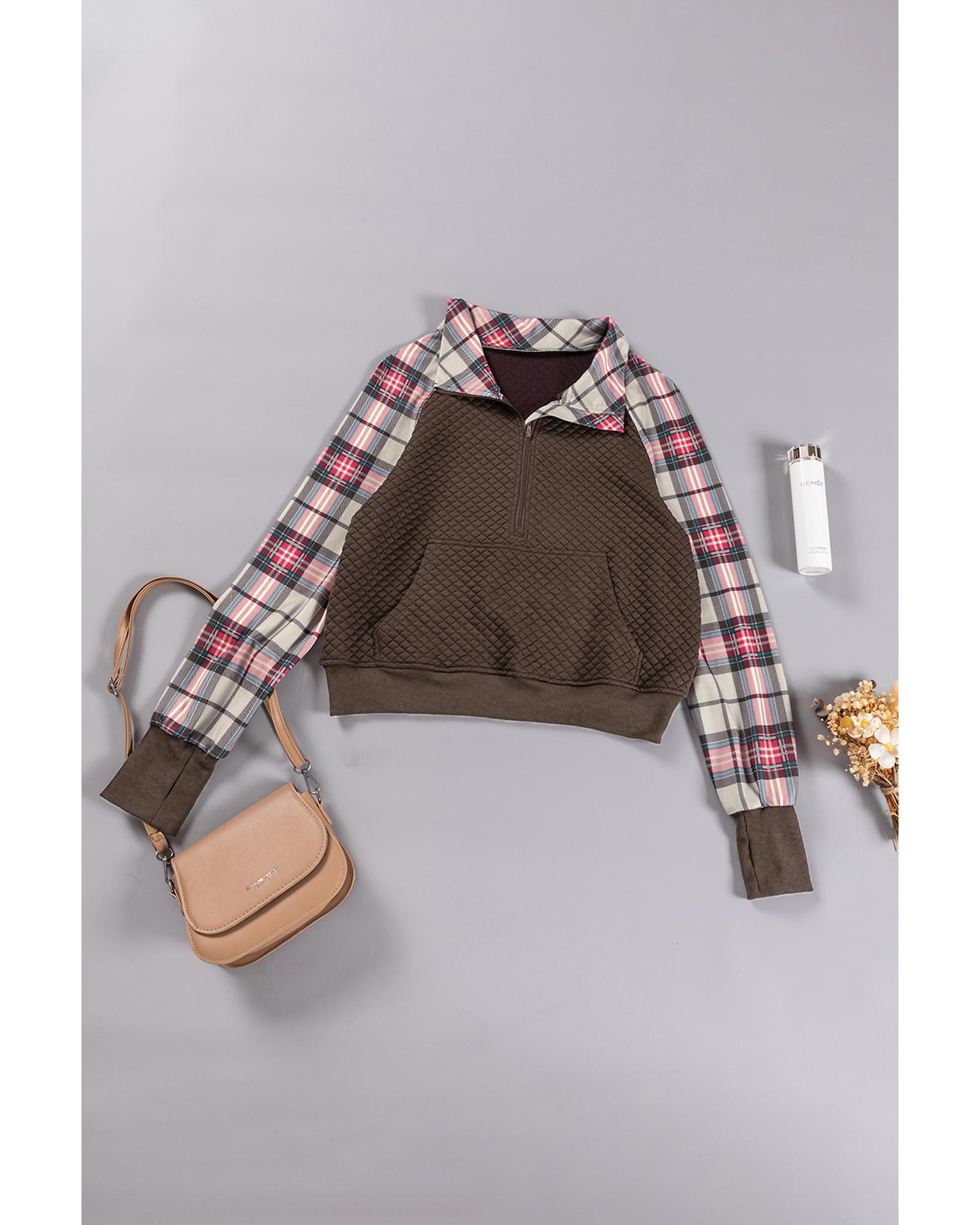 Khaki Printed Plaid Sleeve Patchwork Collared Textured Sweatshirt – S