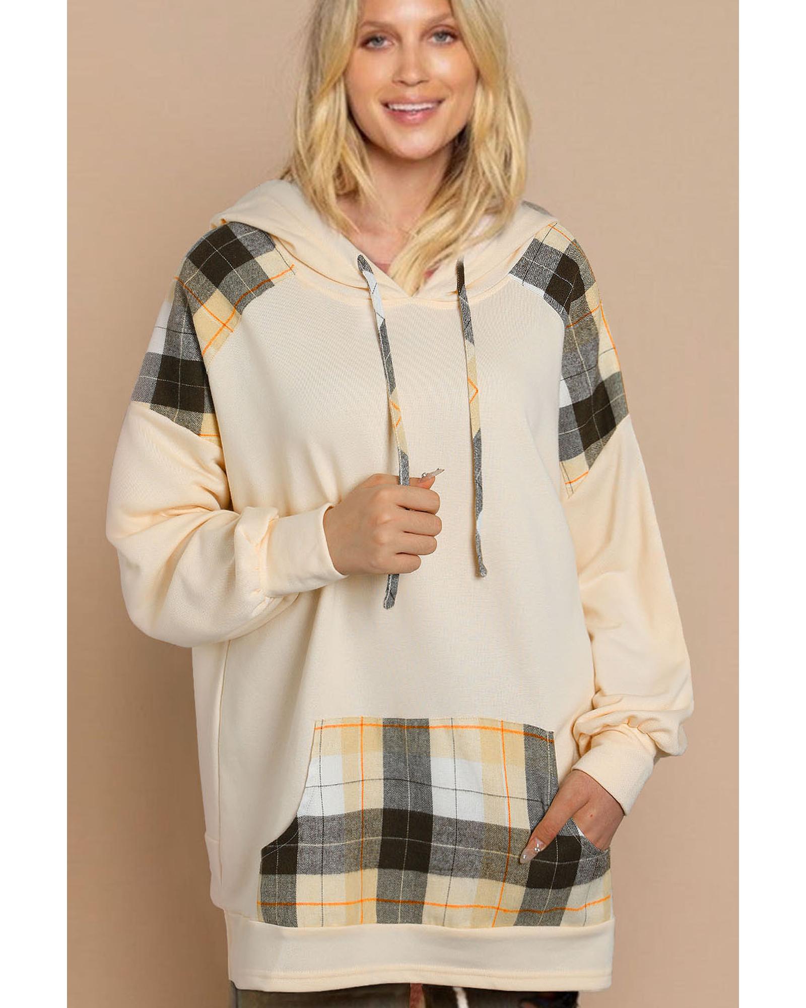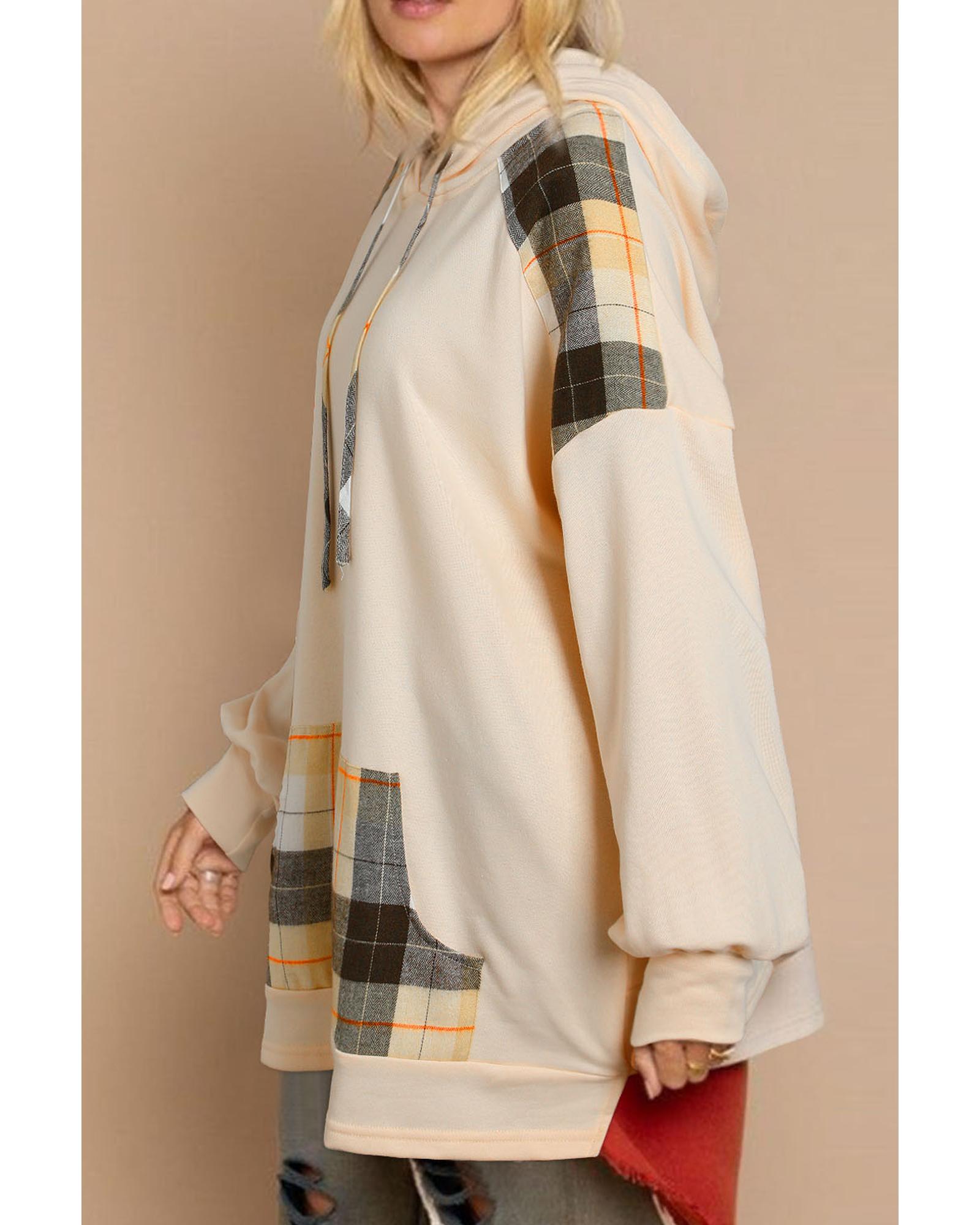 Khaki Plaid Patchwork Kangaroo Pocket Oversized Hoodie – S