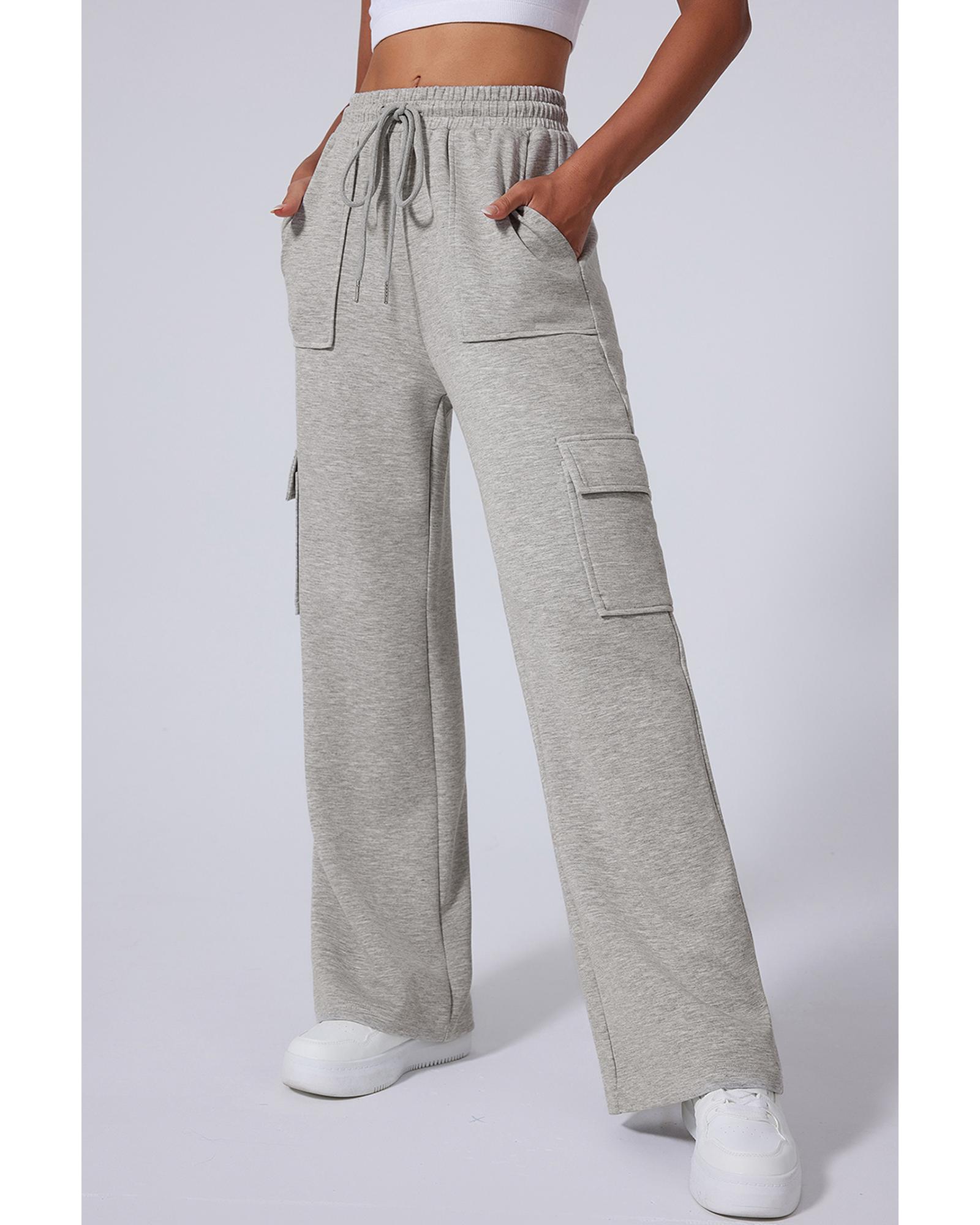 Light Grey Multi Pockets Lace-up High Waist Wide Leg Workout Pants – M