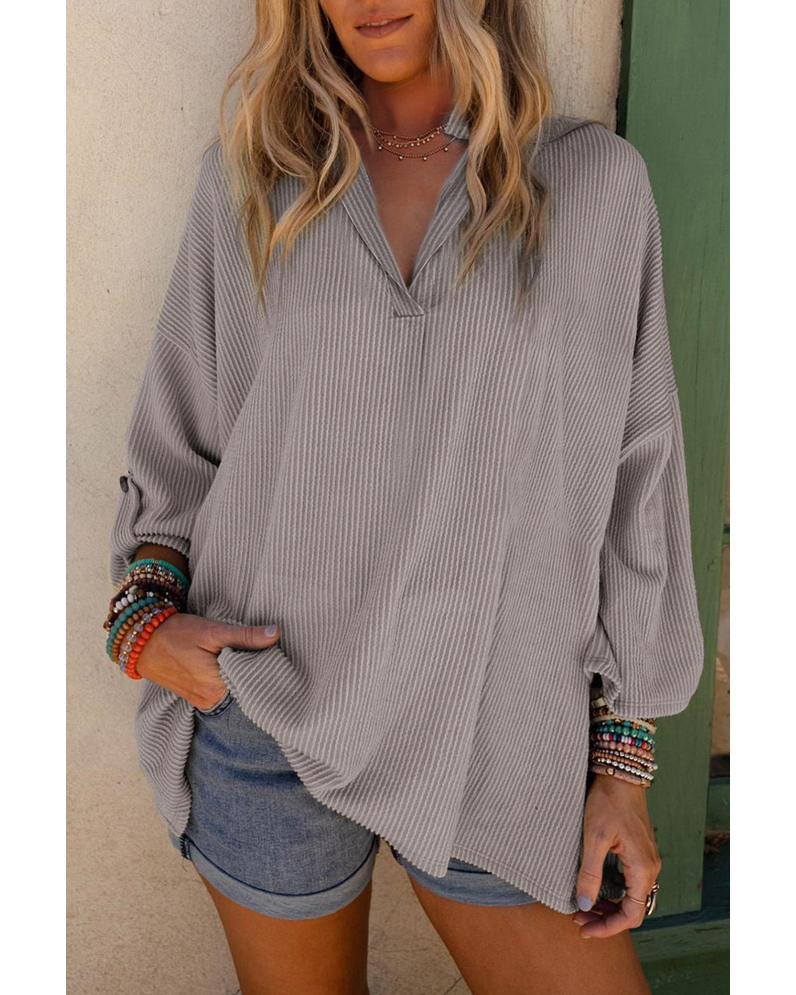 Philippine Gray Ribbed Roll-tab Sleeve Oversize Top – L