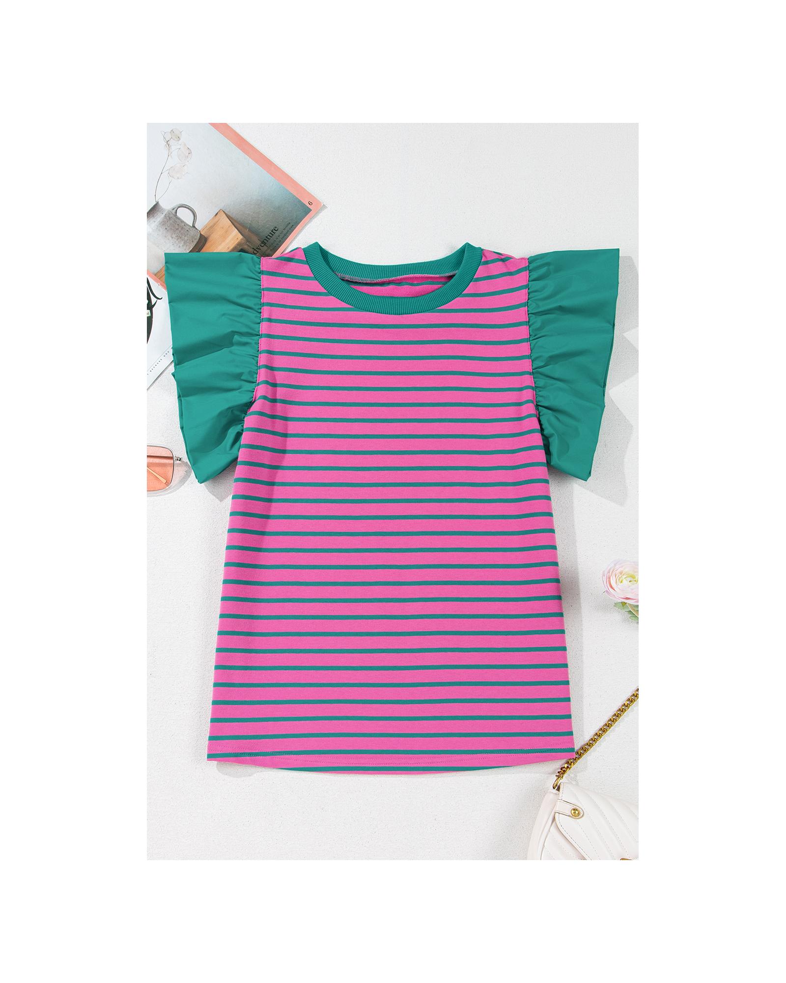 Pink Stripe Colorblock Ruffled Sleeve Crew Neck Blouse – S