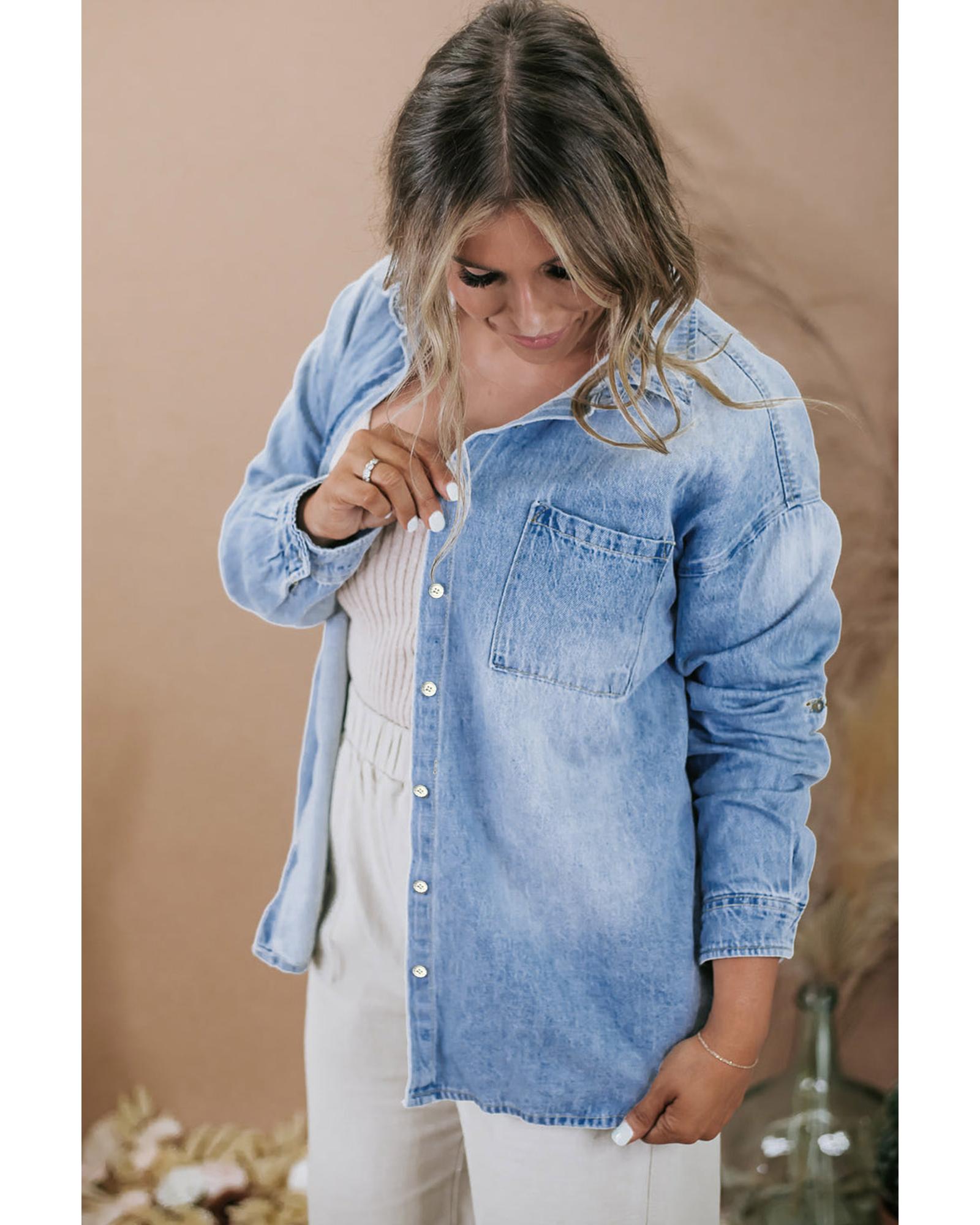 Sky Blue Plus Size Chest Pocket Button-Up Denim Shacket – 1X