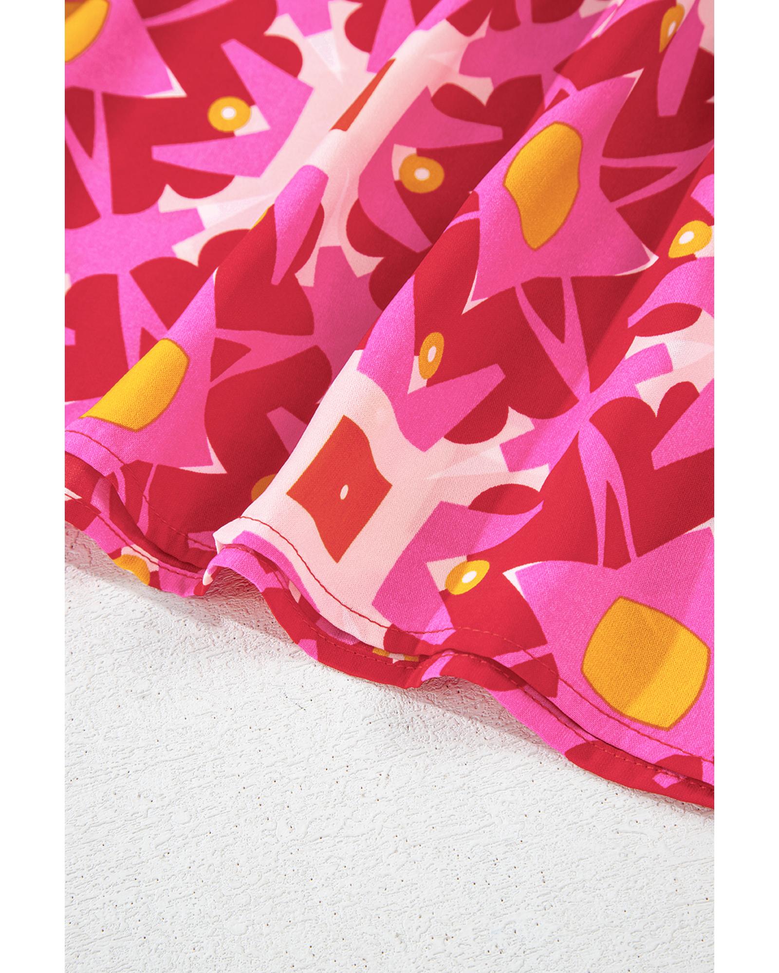 Strawberry Pink Geometric Print Shirred Cuff 3/4 Sleeve Loose Blouse – S