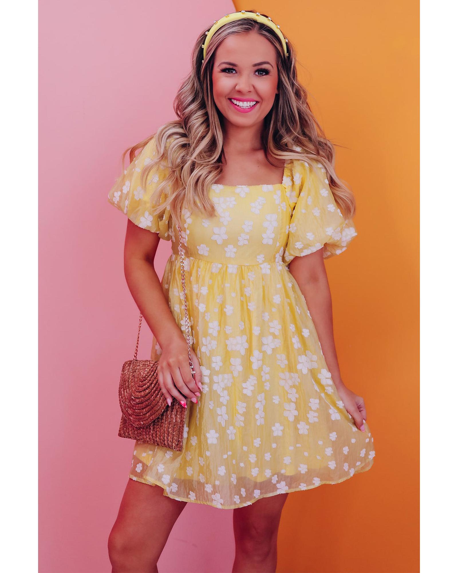 Yellow Boho Flower Jacquard Puff Sleeve Square Neck Mini Dress – L