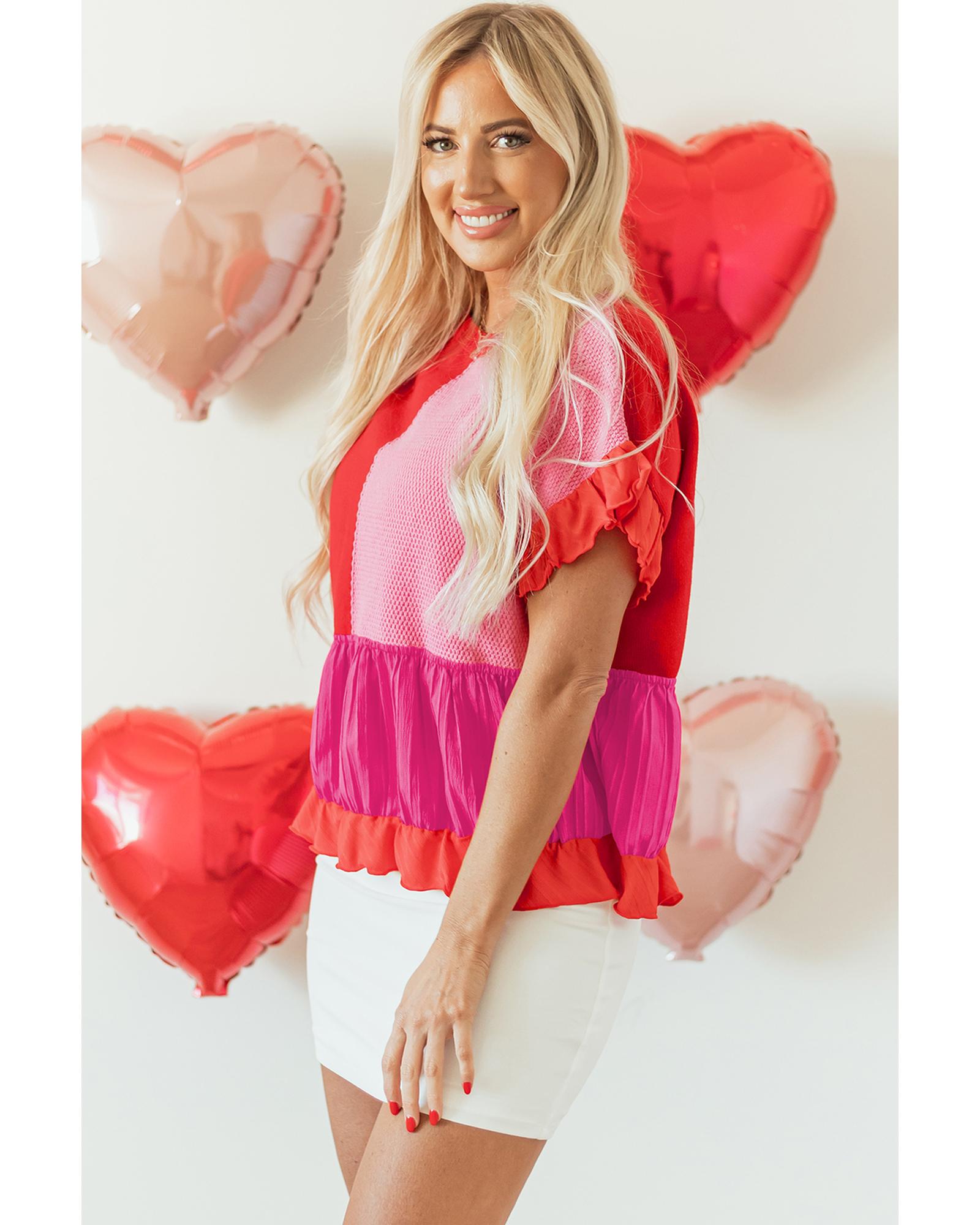 Tomato Red Mix Knitted Patchwork Ruffle Trim Loose Sweater – L