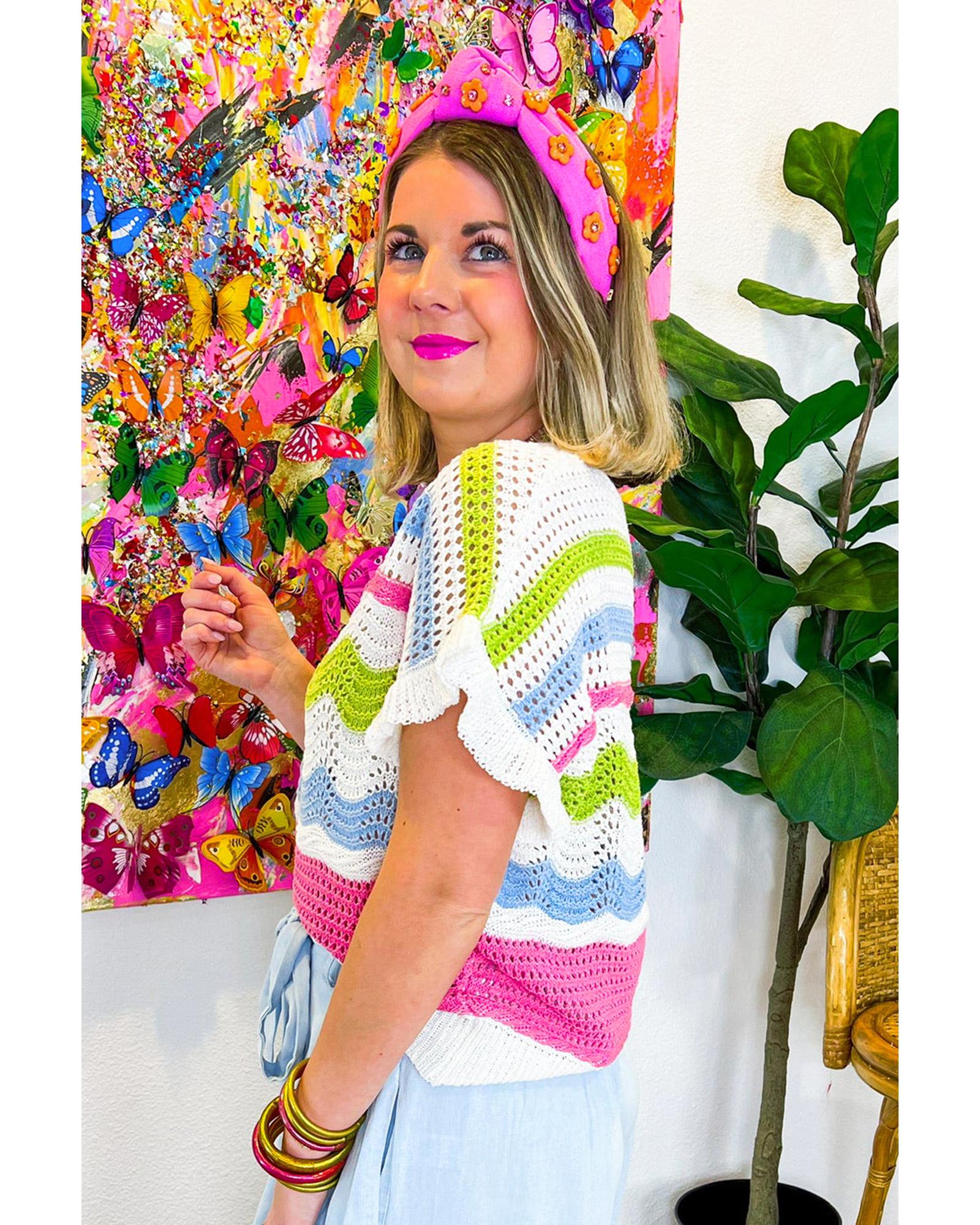 White Colorblock Crochet Knit Ruffled Short Sleeve Sweater Top – S