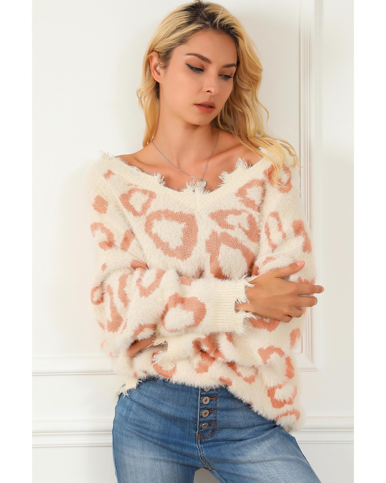 Leopard Animal Print Distressed Trim Fuzzy Sweater – L