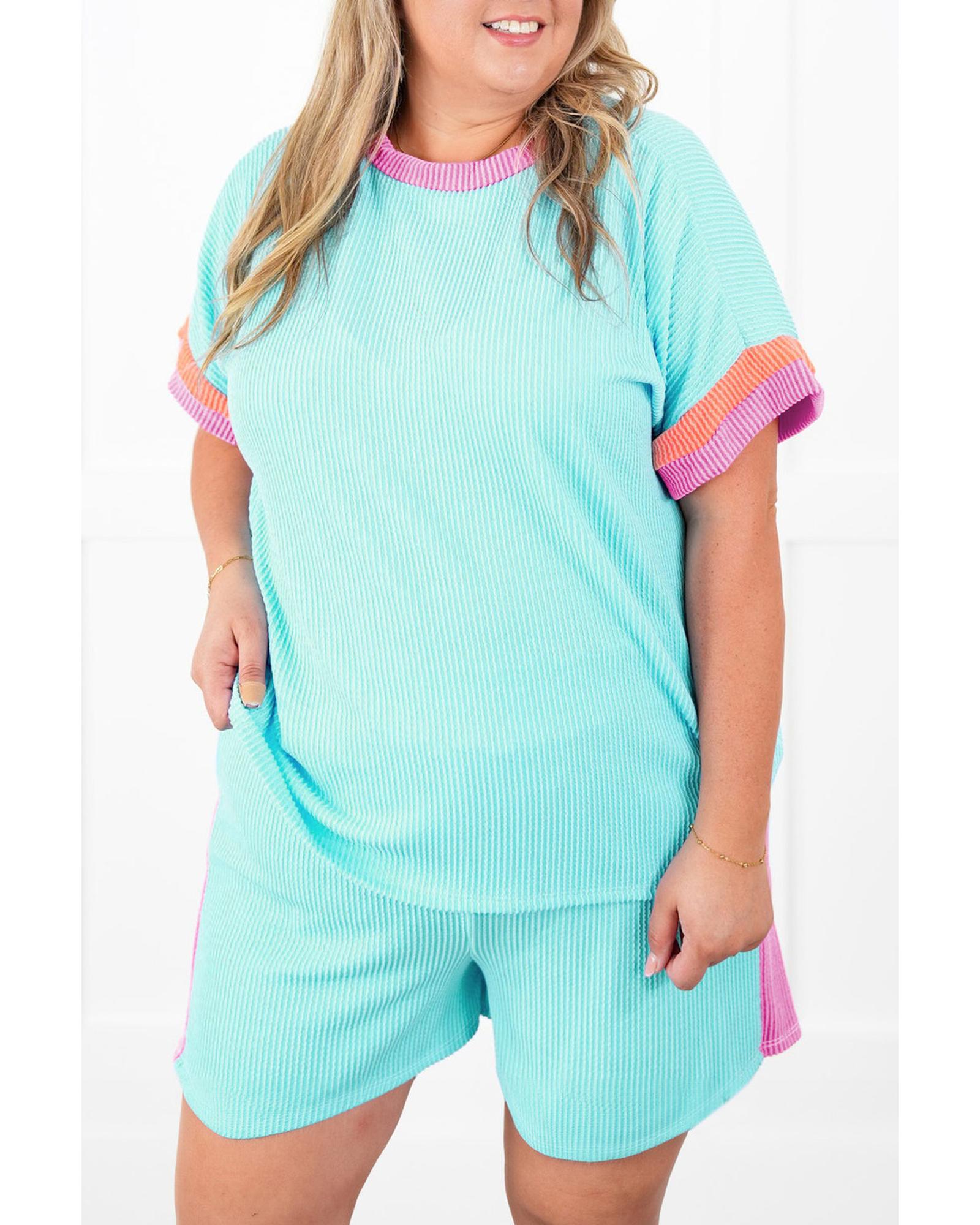 Light Blue Plus Size Color Block Corded Knit Tee and Shorts Set – 2X