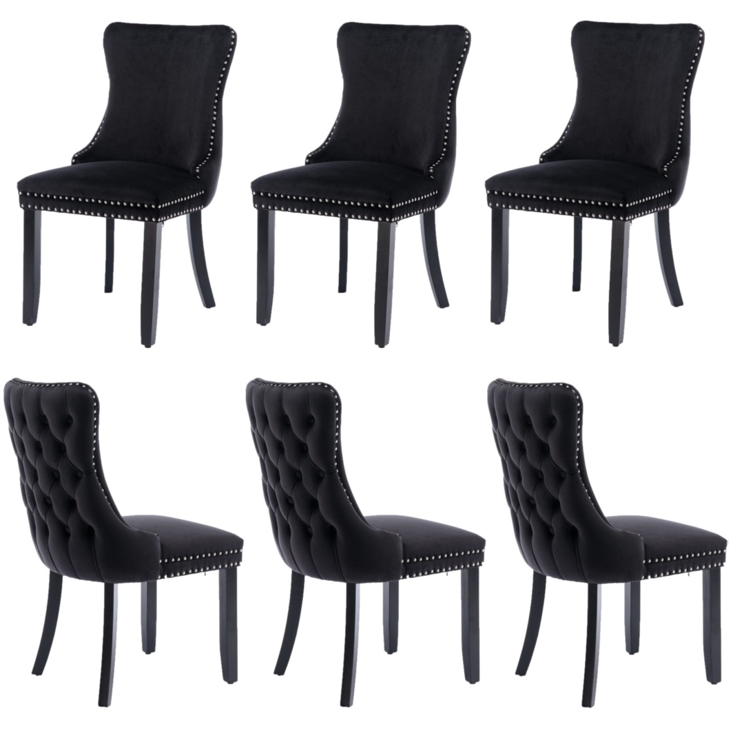 6x Velvet Upholstered Dining Tufted Chairs with Studs Trim and Solid Wood Legs-Black