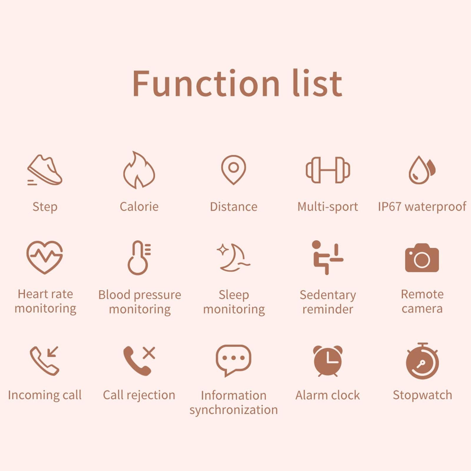 This waterproof smart watch features a 1.22-inch fully touch screen display and offers a variety of health and fitness functions. It supports multiple languages and can be used independently or paired with a mobile app for enhanced features. The device includes call, SMS, and social media reminders, exercise tracking, sleep monitoring, heart rate and blood pressure detection, remote photo control, sedentary reminders, phone finder, and menstrual cycle reminders.