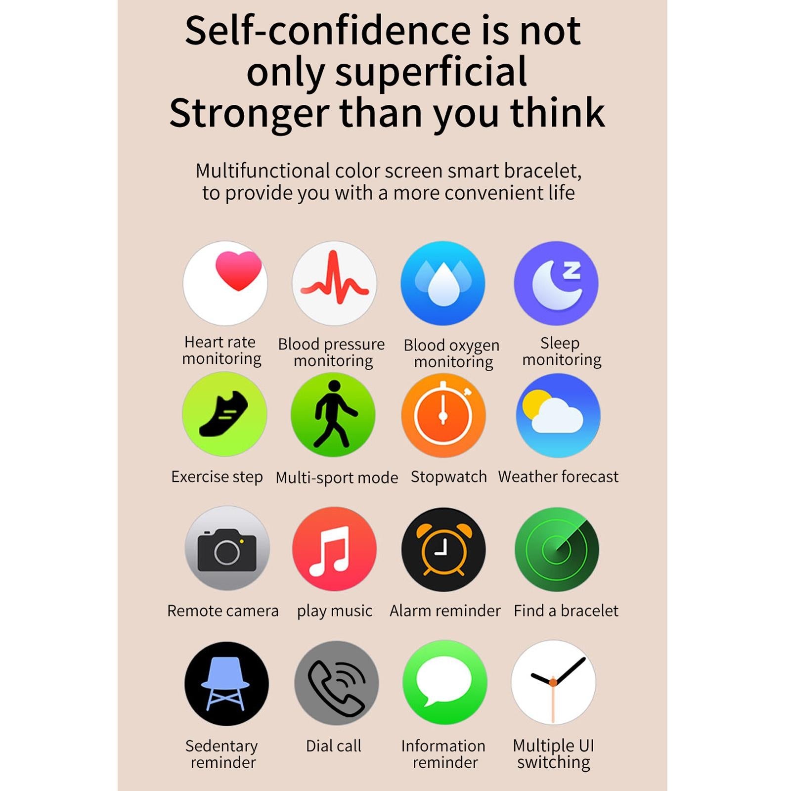 This smartwatch features a 1.3-inch IPS color screen and supports multiple functions including sleep monitoring, heart rate and blood pressure measurement, exercise tracking, and notifications for calls, messages, and social apps. It is designed to be waterproof and compatible with various smartphones, offering a range of health and fitness features in a sleek, user-friendly device.