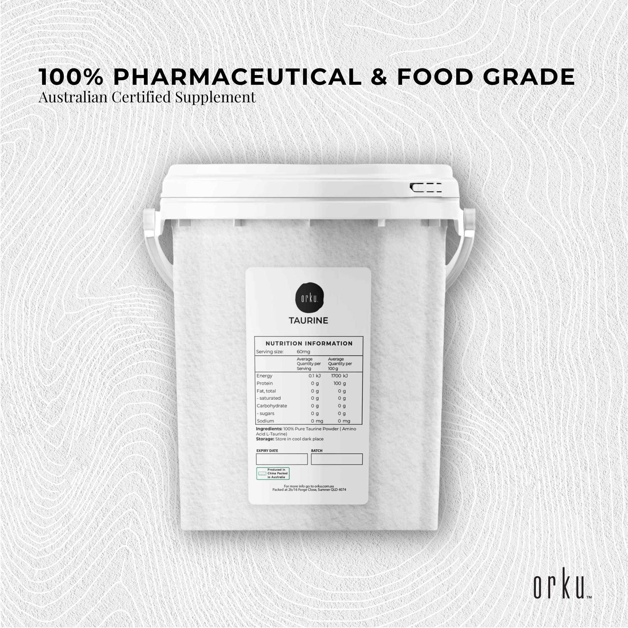 - 1.3kg taurine powder in a resealable bucket