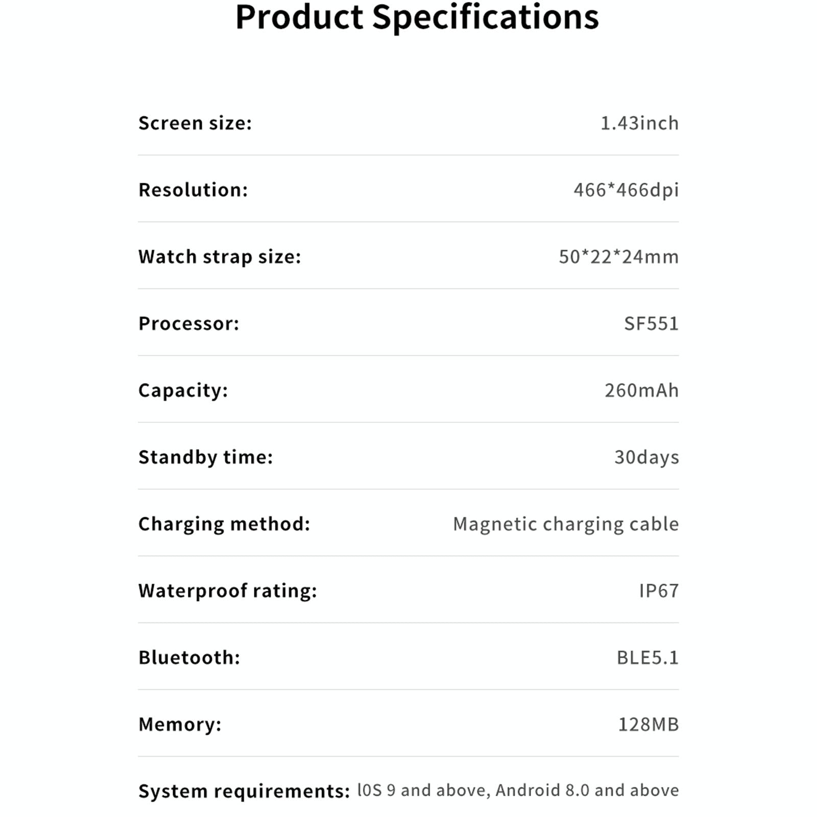 This smart sport watch features a 1.43-inch AMOLED LCD display with a high resolution, offering a full-screen touch experience combined with two control buttons. It supports multiple sports modes and health monitoring functions, including sleep tracking, heart rate, blood pressure, and blood oxygen level detection. The device is compatible with Bluetooth 5.1 BLE and works with Android 8.0 or iOS 9.0 and above. It provides a battery life of approximately 5 to 7 days on a single charge.