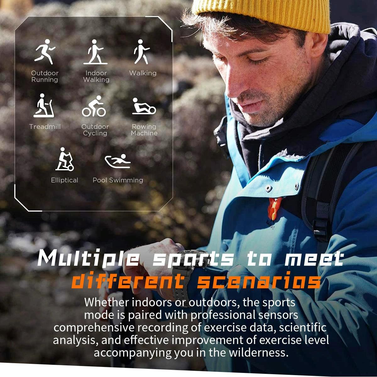 This smartwatch features a 1.5-inch color IPS HD round screen with a resolution of 360×360, providing a clear display. It is equipped with multiple sensors including a heart rate sensing chip, G-sensor, and welding cylinder motor for accurate health and activity monitoring. The device is powered by a 600mAh polymer cobalt battery with magnetic suction charging, ensuring long-lasting use. It supports multiple languages and offers various functions such as step counting, sleep tracking, heart rate monitoring, exercise tracking, blood pressure and oxygen level measurement, weather updates, camera and music control. Made with an alloy case and a silicone or steel wristband, it combines durability with comfort. The smartwatch is lightweight, weighing approximately 82 grams, for comfortable daily wear.