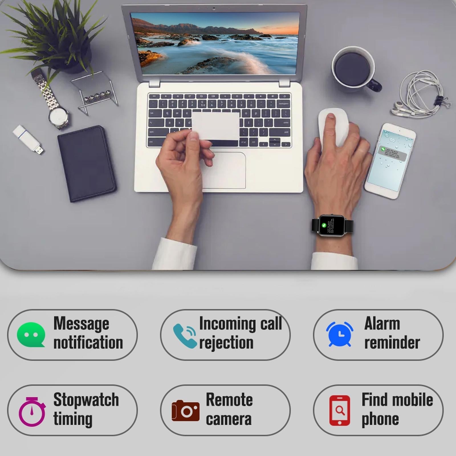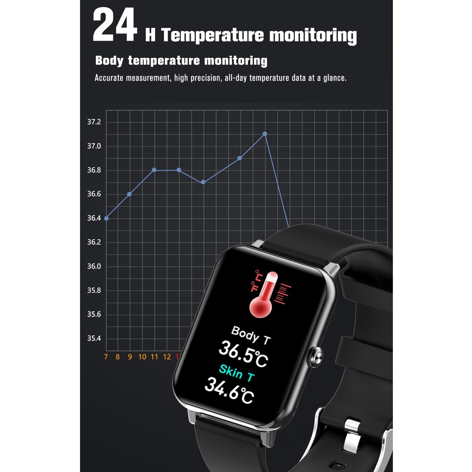 This smartwatch features a 1.69-inch TFT screen with a resolution of 240×280, supporting various health and activity monitoring functions. It offers body temperature, sleep, heart rate, blood pressure, blood oxygen, pedometer, distance, calories, stopwatch, and multi-sports mode tracking. Additionally, it provides call and message reminders, alarm clock, sedentary alerts, water and medicine intake reminders, and a remote camera function. The device is designed with an IP67 waterproof rating and a silicone strap for durability and comfort.