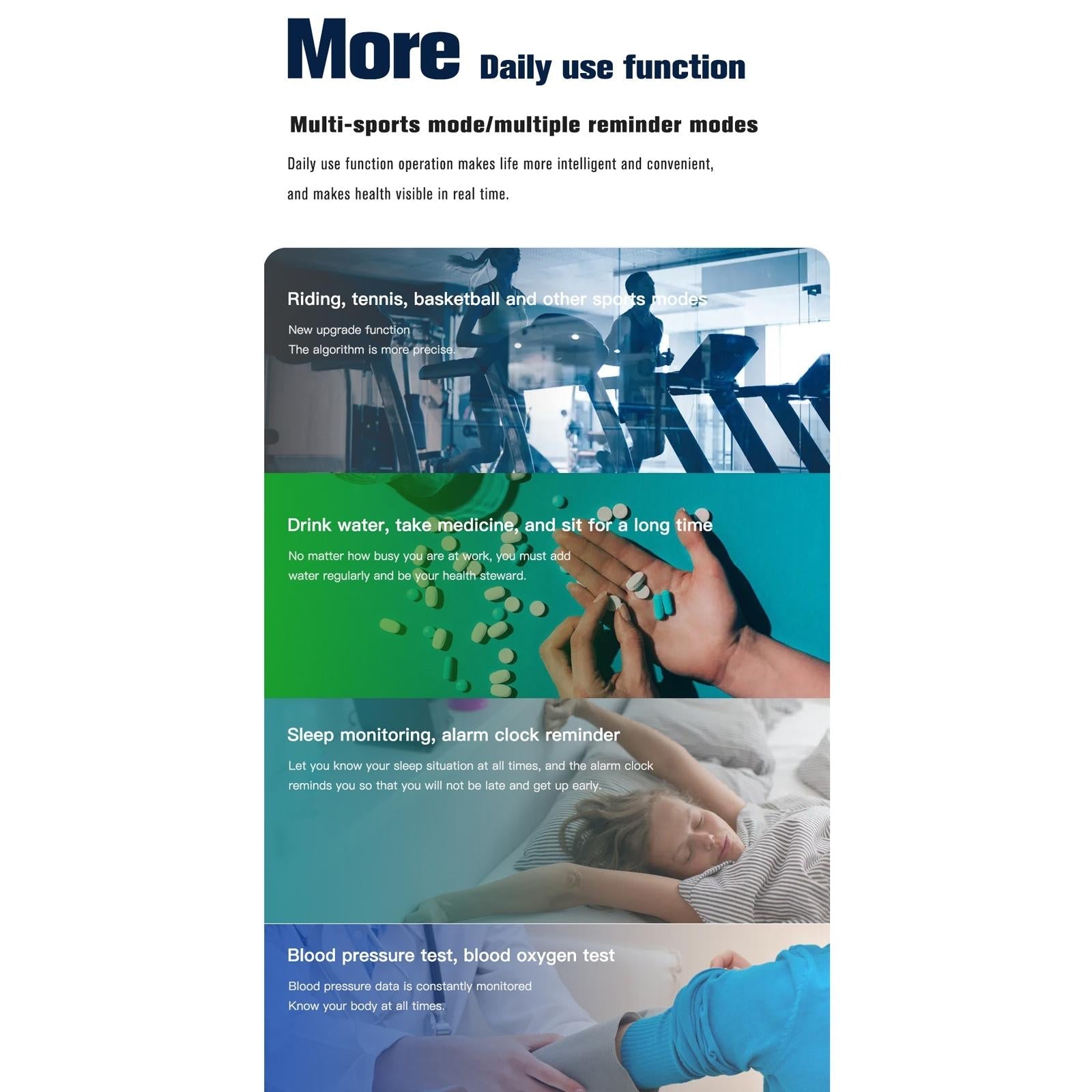 - Call, message, alarm, sedentary, water, and medicine reminders