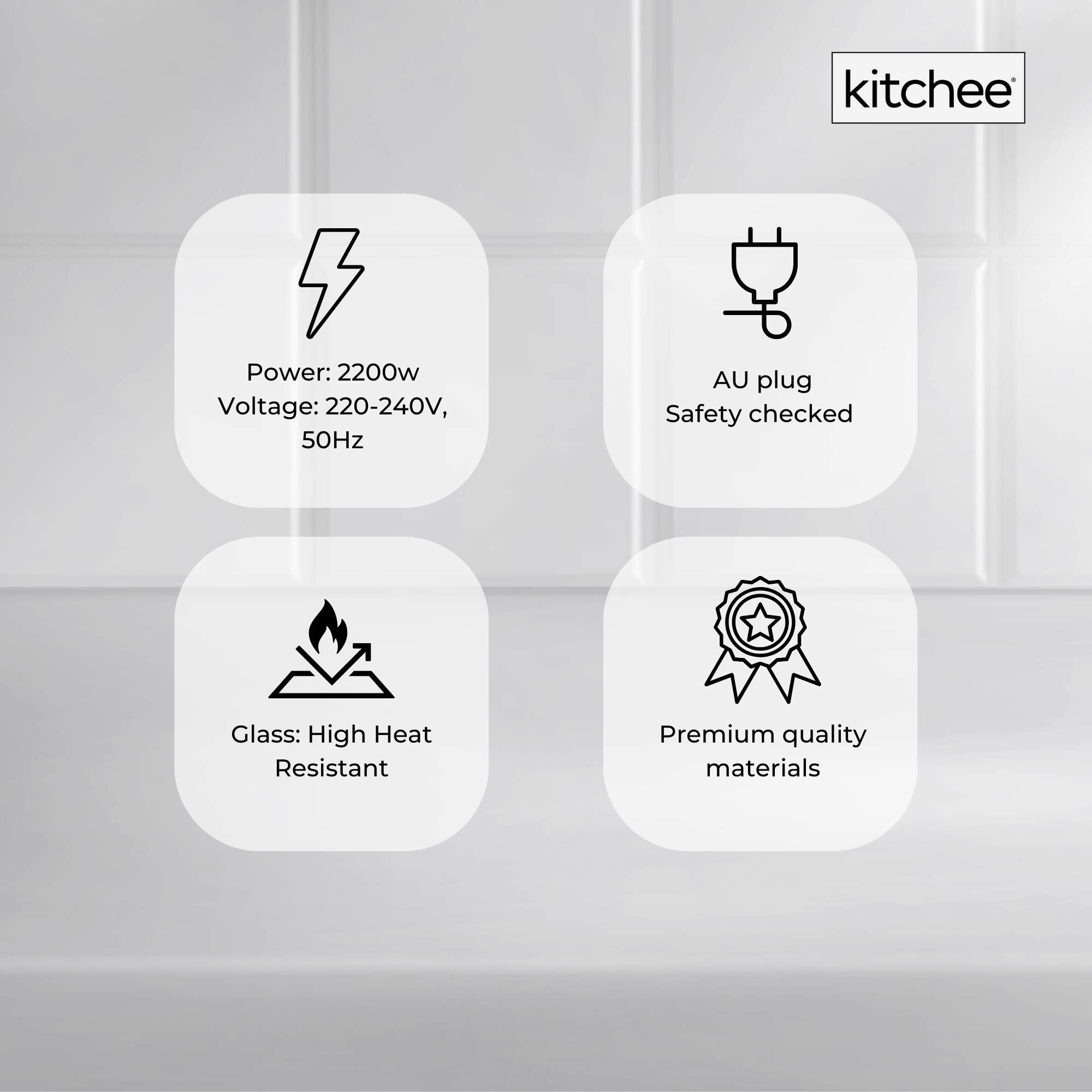 This 1.7L electric glass kettle combines modern design with practical features, providing a stylish and efficient way to boil water. Made from high heat resistant tempered glass, it offers a healthy and safe boiling experience with automatic shut-off and a cordless 360-degree rotating base. The kettle features LED indicator lights for easy operation and a manual lid for convenient filling.