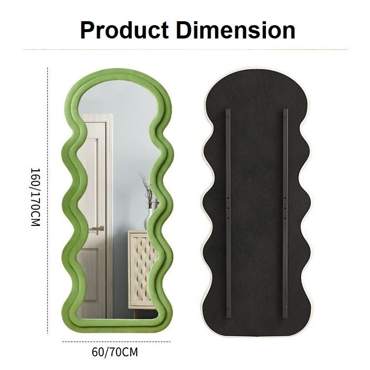 This full-length floor mirror features an asymmetrical, wavy design that adds a modern and stylish touch to any space. Its unique shape and elegant craftsmanship make it a standout piece suitable for living rooms, bedrooms, bathrooms, or hallways. The mirror provides a full view from head to toe and creates an illusion of a larger room, enhancing your home decor.