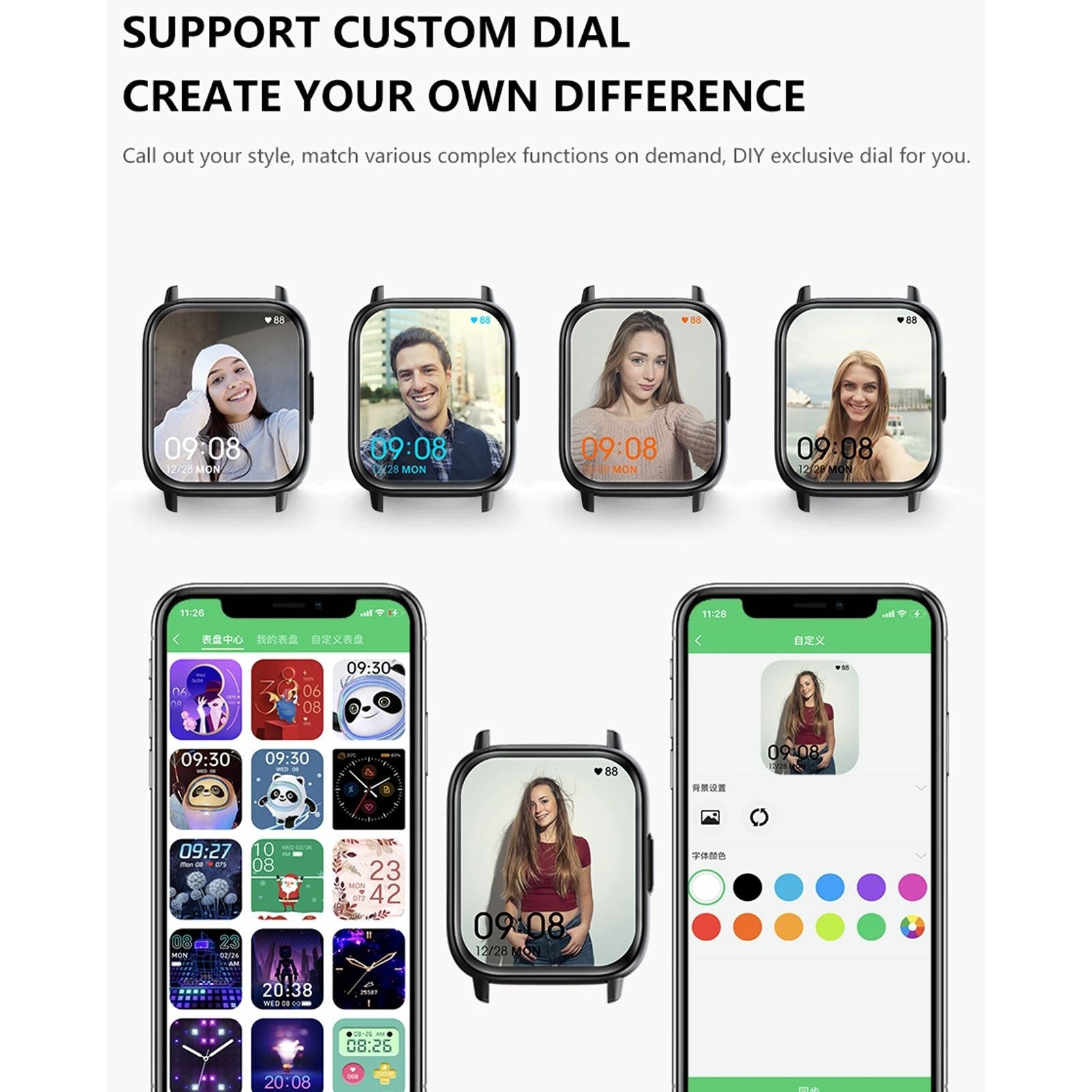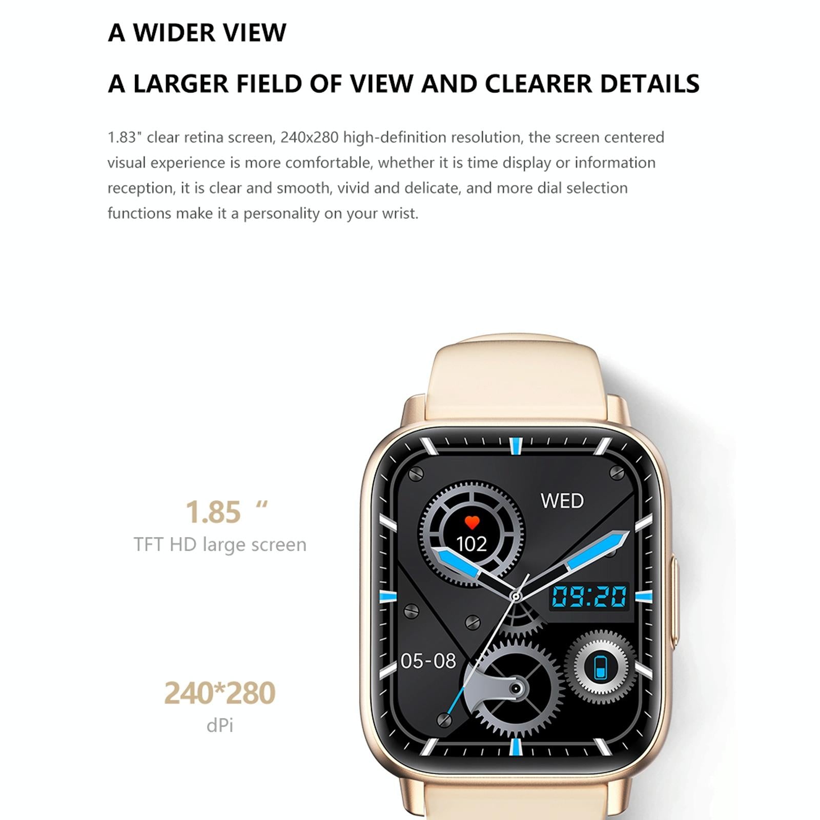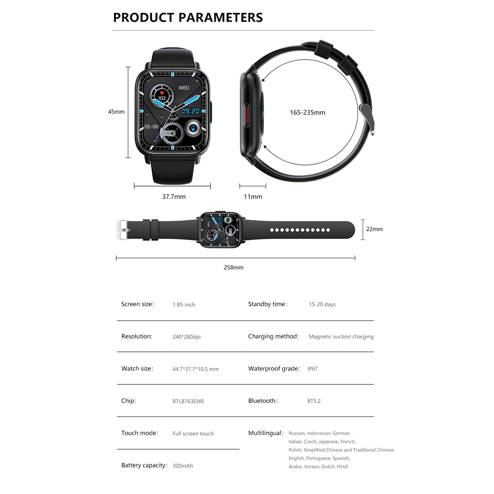 This smart sport watch features a 1.83-inch full screen TFT LCD display with touch functionality and a single button. It offers comprehensive health monitoring including sleep, heart rate, blood pressure, blood oxygen, temperature, and blood sugar. The device supports various functions such as call management, message notifications, sedentary reminders, and music control. Additional features include search functions, step counting, countdown, stopwatch, breathing exercises, and multi-language support for both the watch firmware and app.