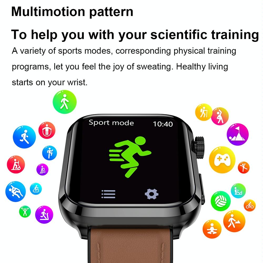 This smartwatch features a 1.91-inch IPS high-resolution screen and a silicone band, offering waterproof protection with an IP67 rating. It supports body temperature monitoring and ECG functions, making it suitable for health tracking. The device is compatible with Android 4.4 and above, as well as iOS 8.2 and above, and provides various health sensors for comprehensive monitoring.