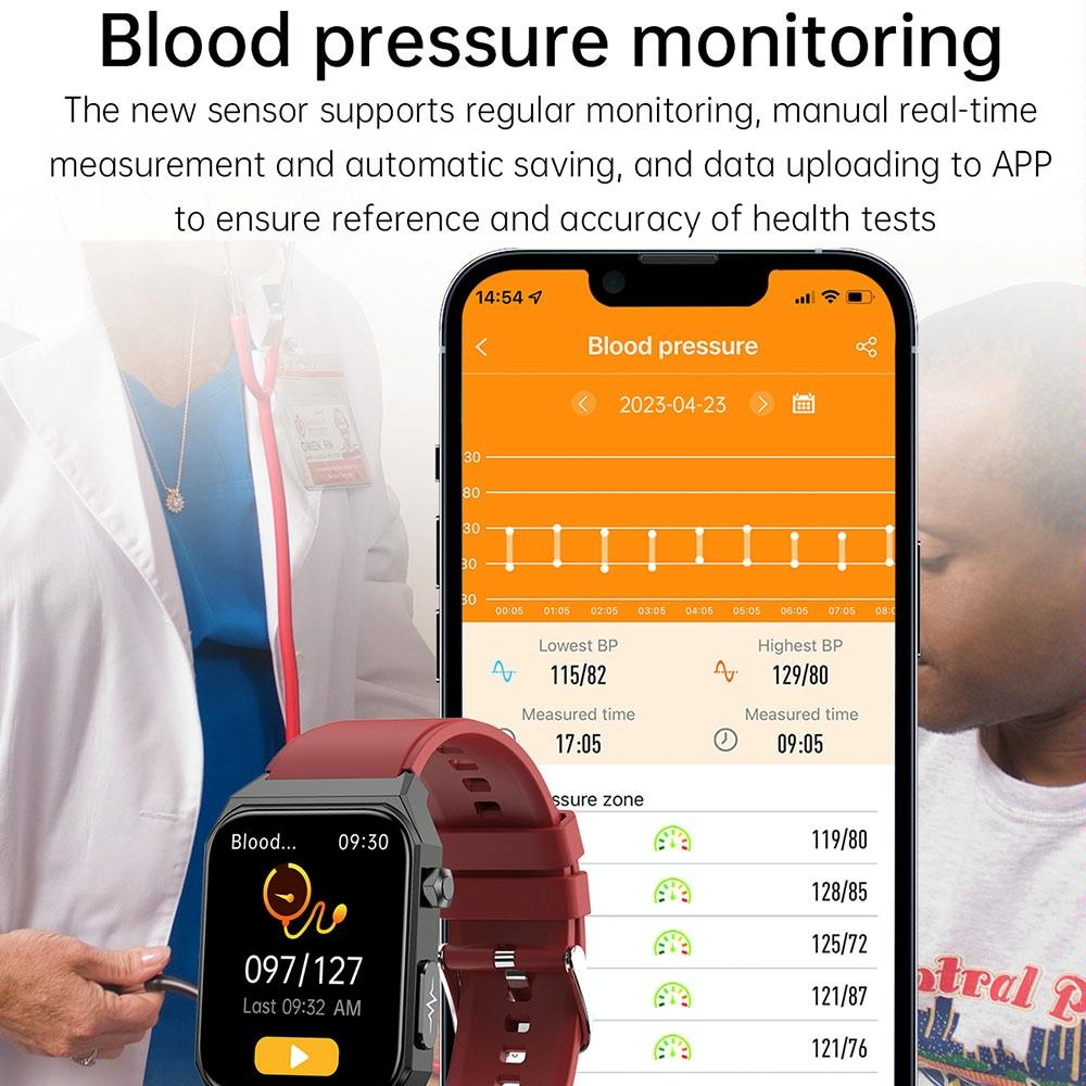 This waterproof ECG smart watch features a 1.91-inch high-definition touch screen and a silicone band, offering comprehensive health monitoring and smart functions. It is designed to support users in tracking their heart health, blood oxygen levels, body temperature, blood sugar, and sleep patterns, while also providing notifications and lifestyle reminders. The device combines advanced sensors with a durable metal alloy casing, ensuring reliable performance and long battery life.