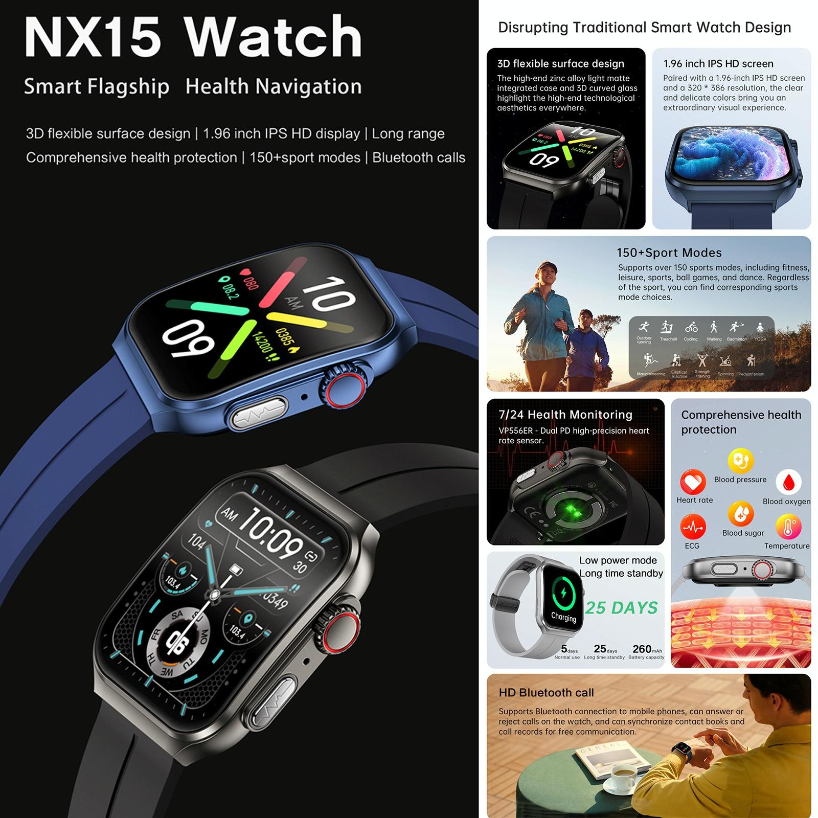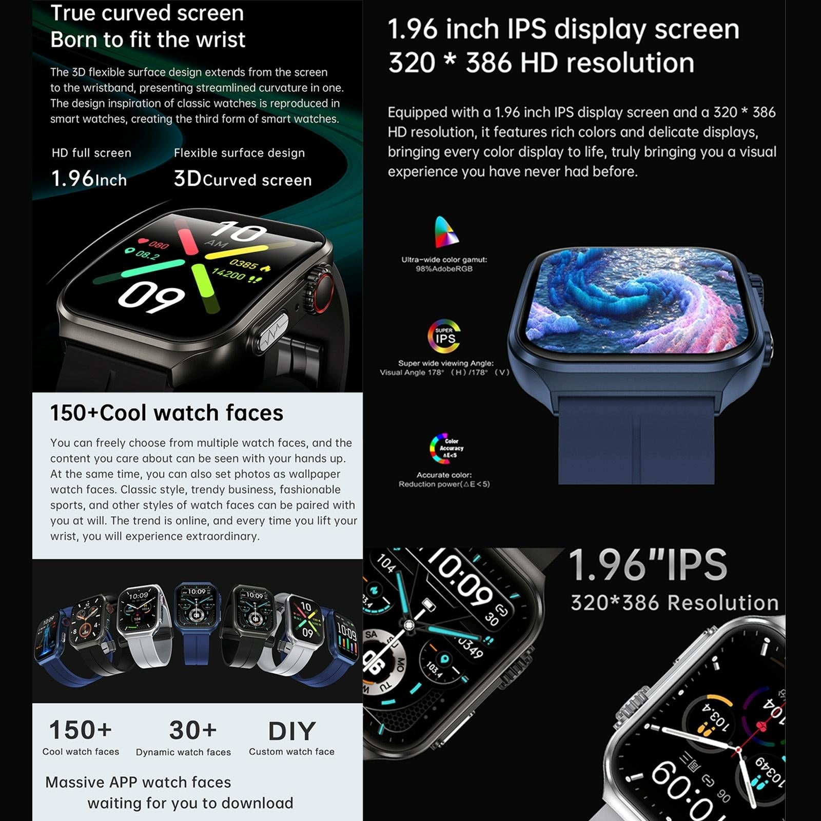 This smartwatch features a 1.96-inch IPS screen with a resolution of 320×386 and a brightness of 500 lumens, providing clear and vibrant display quality. It is equipped with a G + F touch panel for easy navigation and is constructed with a durable PC+ABS bottom case and a silicone strap. The device supports seamless connectivity via BLE 5.3 Bluetooth and includes multiple health monitoring functions such as heart rate, blood pressure, and blood oxygen sensors. It also offers water resistance with an IP68 rating, multiple sport modes, sleep detection, and music control for added convenience.