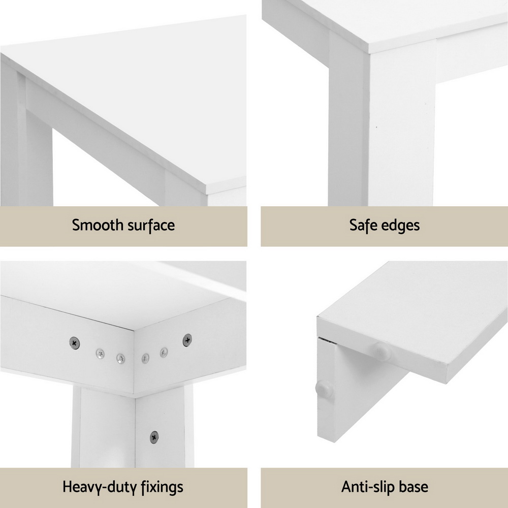 - Dining Table: 120cm x 70cm x 75cm, weight capacity 80kg, material: particle board with melamine finish, color: white