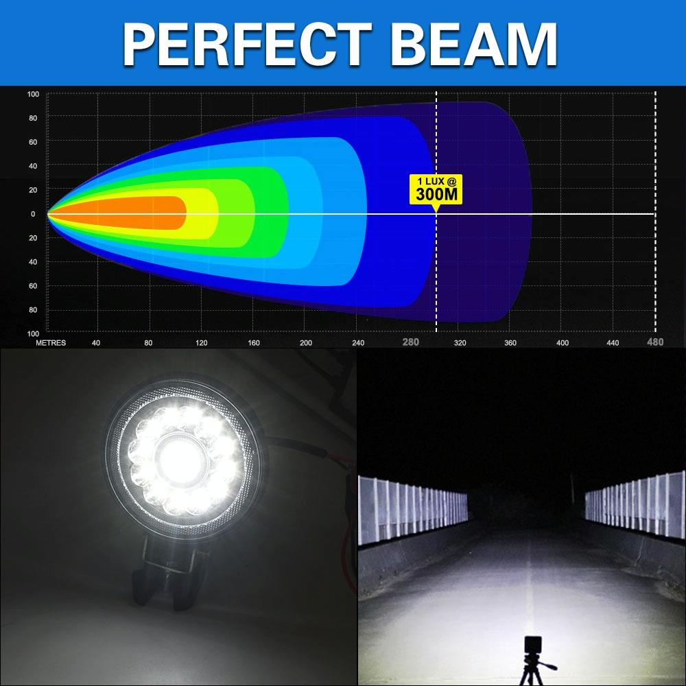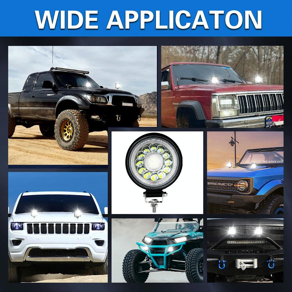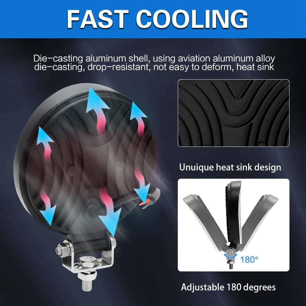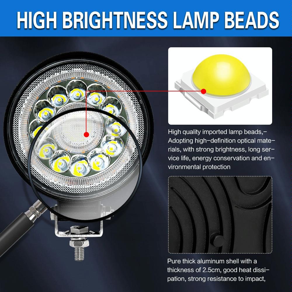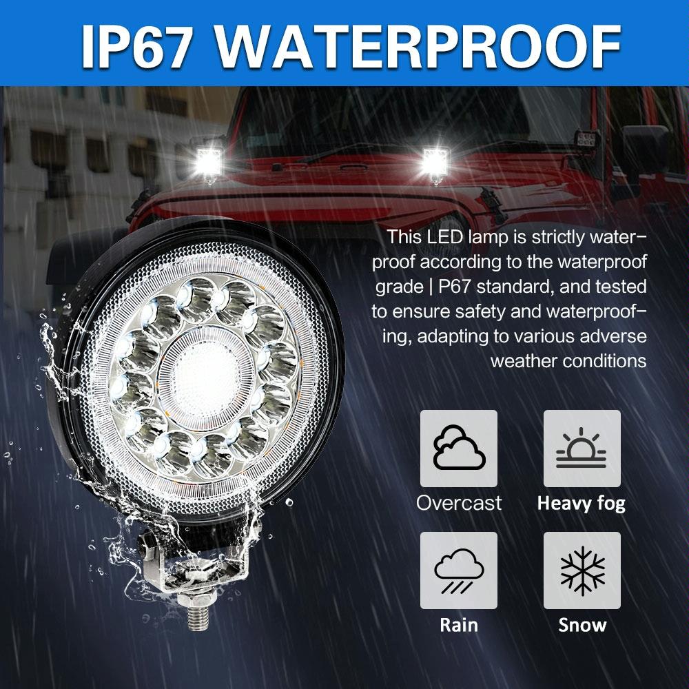 This product is a 4-inch round double circle angel eye work light designed for enhanced visibility and safety. It features high-quality LED chips and dual DRL apertures, providing a stylish appearance and improved illumination in various weather conditions. The durable construction includes a fully die-cast aluminum alloy body for effective heat dissipation and a long lifespan, along with a high-transparency, hard panel for better light penetration. It is built to withstand harsh environments with dustproof, shockproof, rustproof, coldproof, and IP67 waterproof features. The adjustable mounting accessories allow for 360-degree rotation, making it easy to direct the beam as needed.