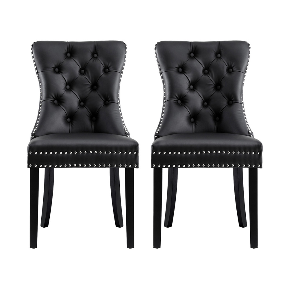 This set includes two dining chairs designed to enhance your dining area with a combination of style and comfort. Upholstered in either PU leather or plush velvet, each chair features a button-tufted backrest and rivet edging for a sophisticated appearance. The cushioned backrest filled with high-resilience foam provides excellent comfort, while the rubberwood legs offer sturdy support. Anti-slip feet help protect your floors, making these chairs both practical and stylish for any dining space.