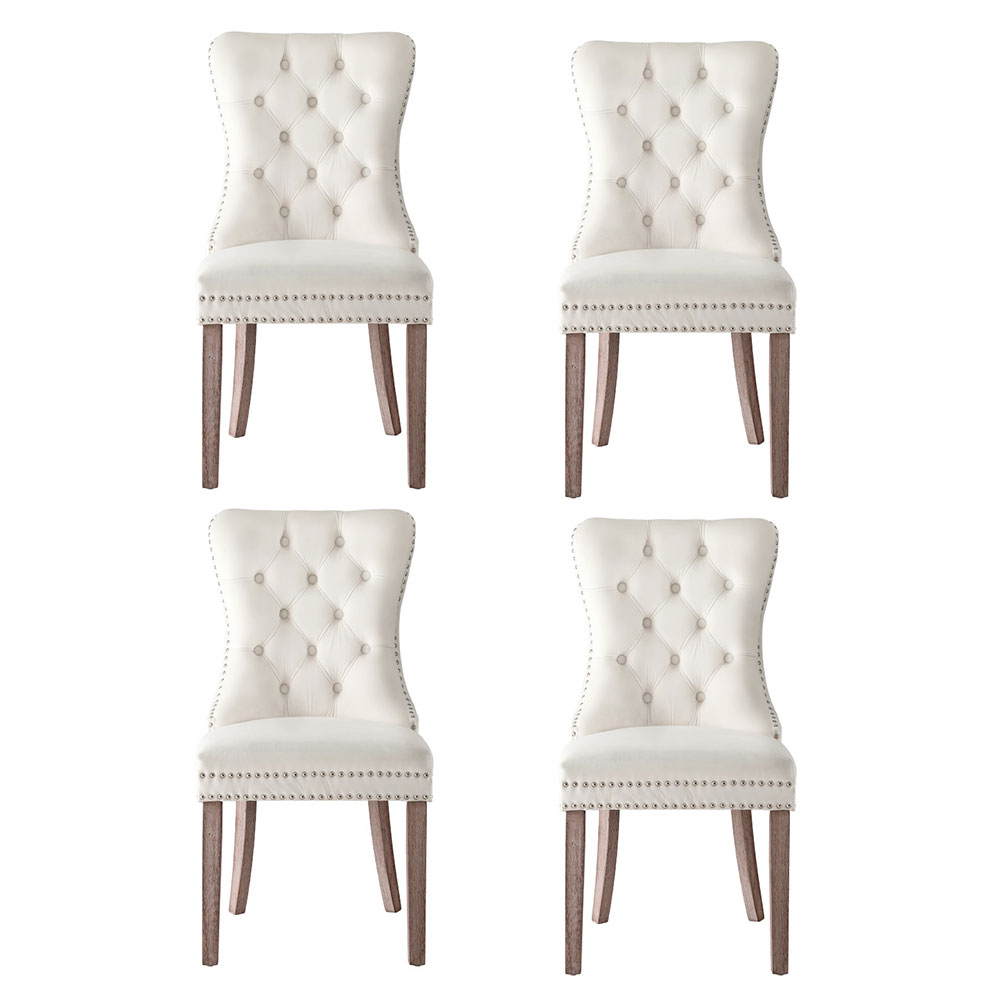 This set includes four dining chairs designed to enhance your dining area with a blend of style and comfort. Upholstered in plush velvet, each chair features a button-tufted backrest and rivet detailing along the edges. The cushioned backrest filled with high-resilience foam offers excellent support, while the rubberwood legs provide stability and durability. Anti-slip feet protect your floors, making these chairs both practical and elegant for everyday use.