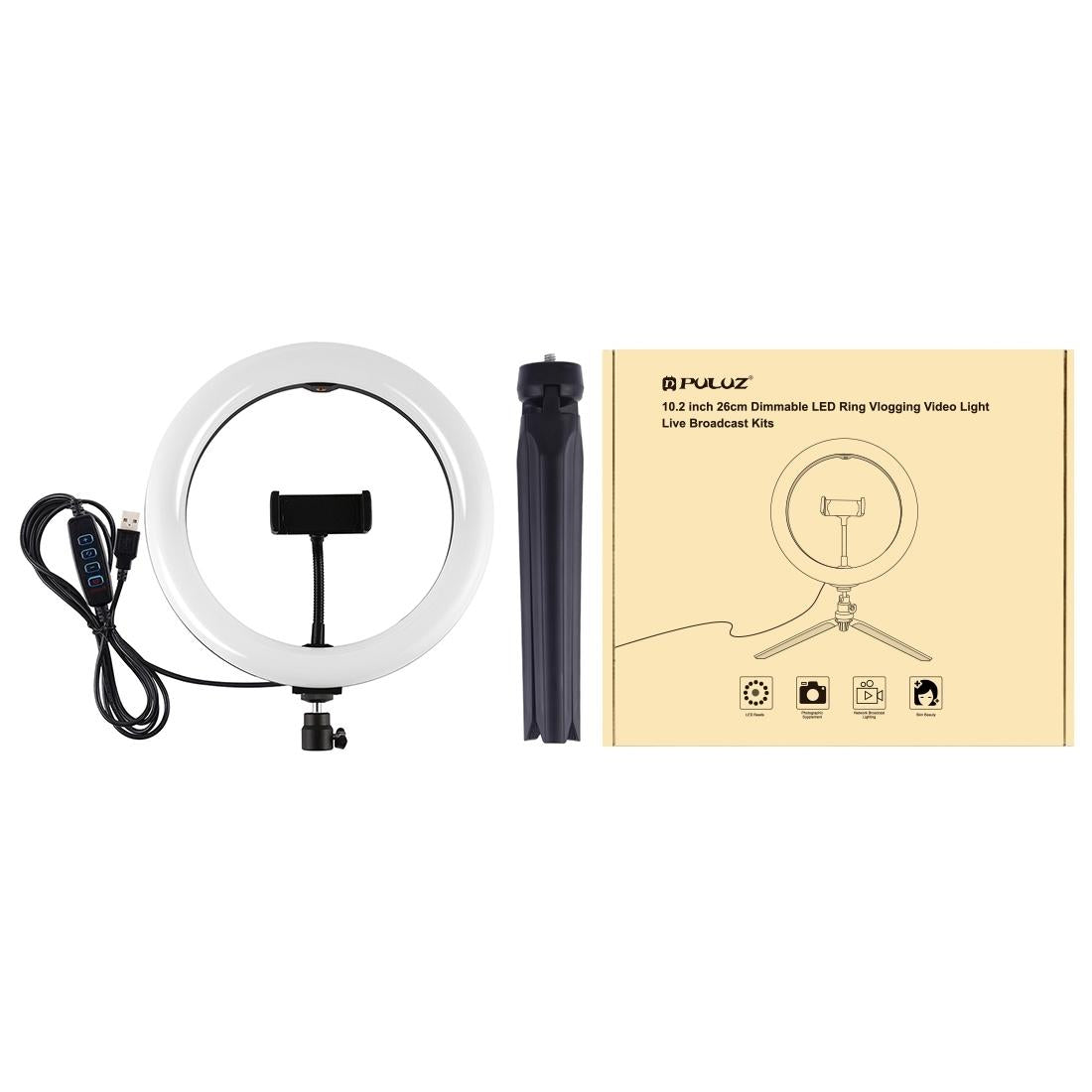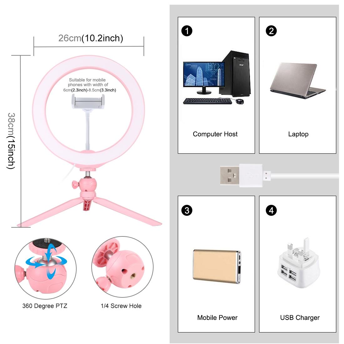10.2 Selfie Beauty Light with Tripod Mount and Usb 3 Modes Dimmable Led Ring for Vlogging and Photography Cold Shoe Ball Head and Phone Clamp – Black