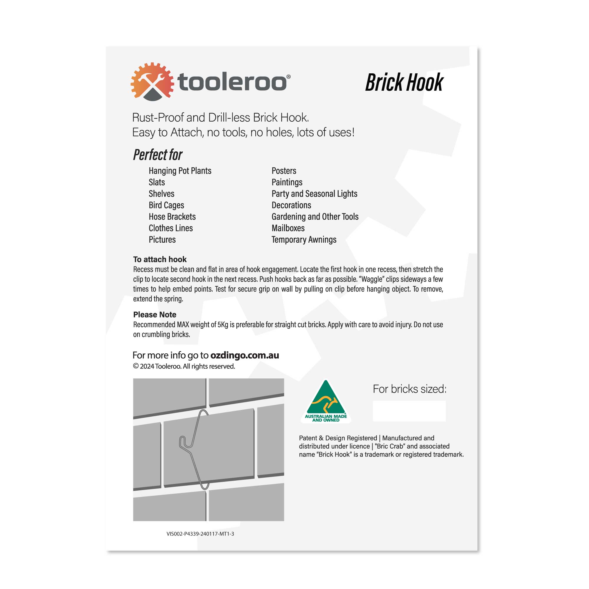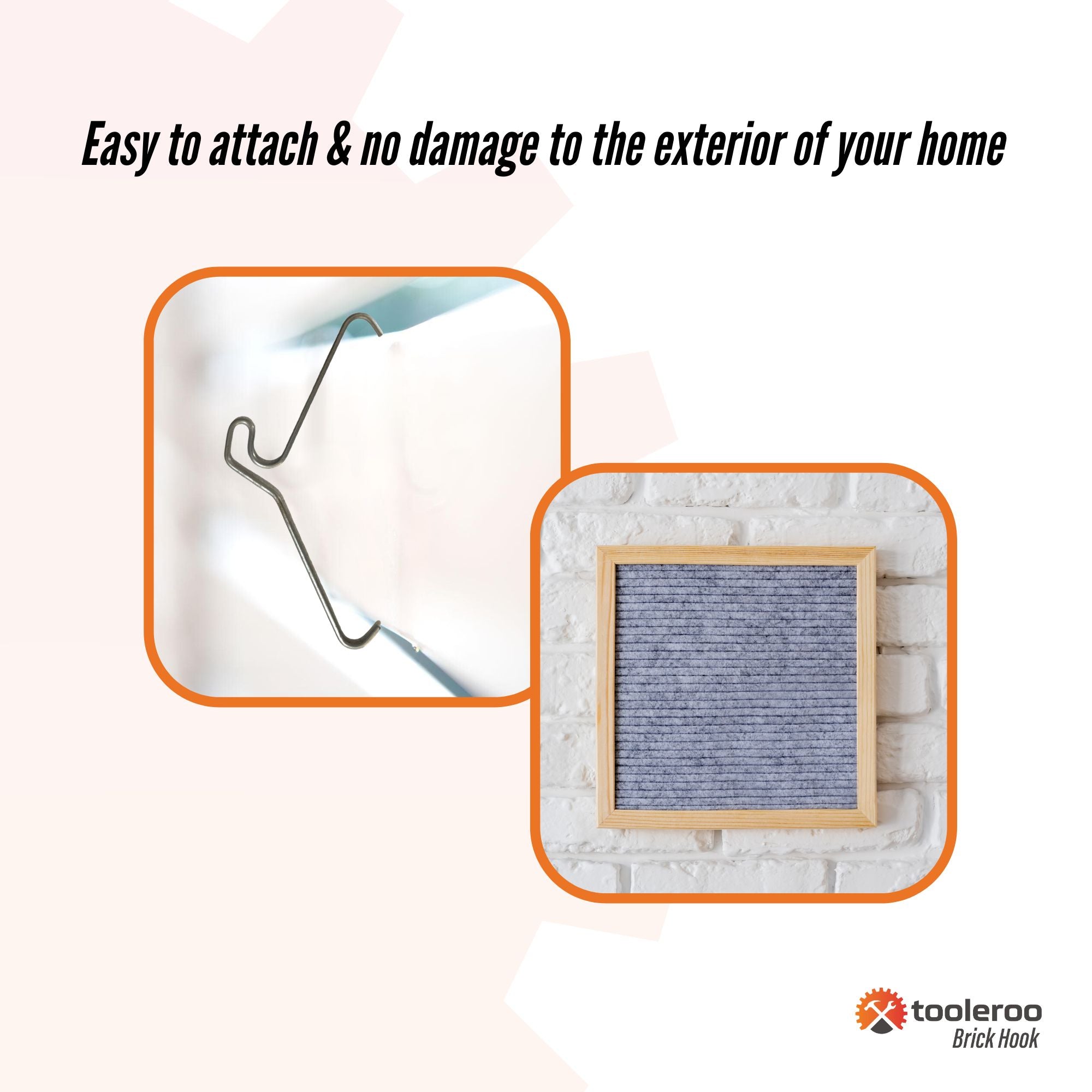 This set includes 10 brick hooks designed for easy attachment to external brick surfaces. Made from rust-proof galvanized steel, these hooks are suitable for hanging various items without causing damage to your walls. They are simple to install and remove, making them a versatile solution for outdoor and indoor use.