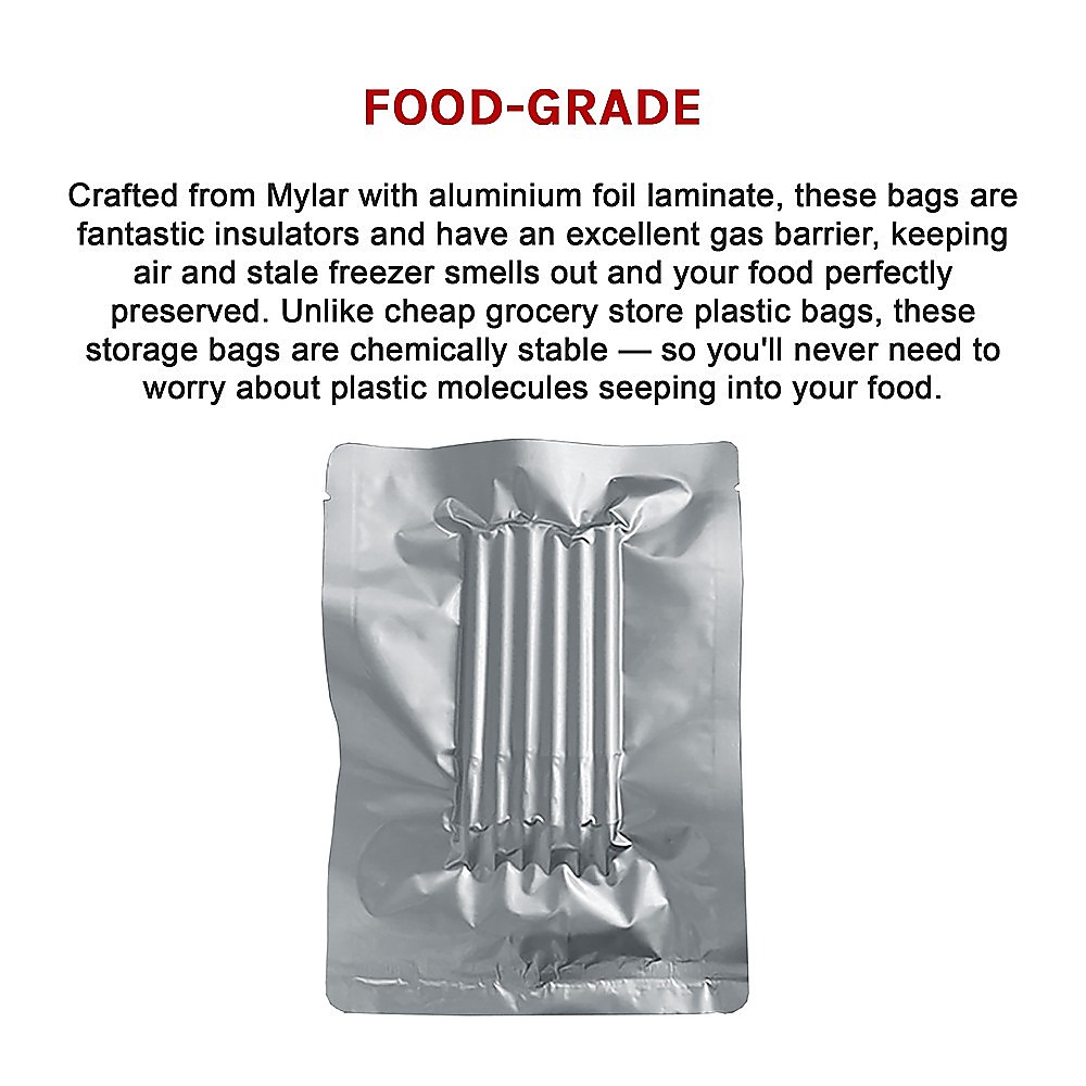 This set of food storage bags is designed to keep your food fresh and protected. Made from durable Mylar with an aluminum foil laminate, these bags provide excellent insulation and a strong gas barrier, preventing air and odors from affecting your stored items. They are suitable for freezer storage and can be boiled directly in water, ensuring versatility and convenience.
