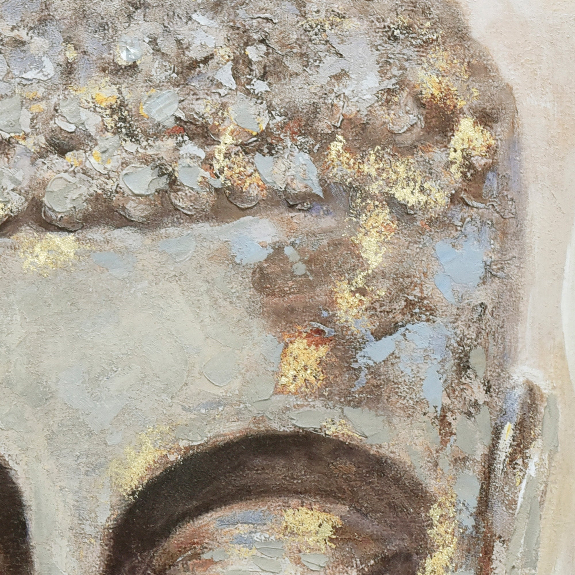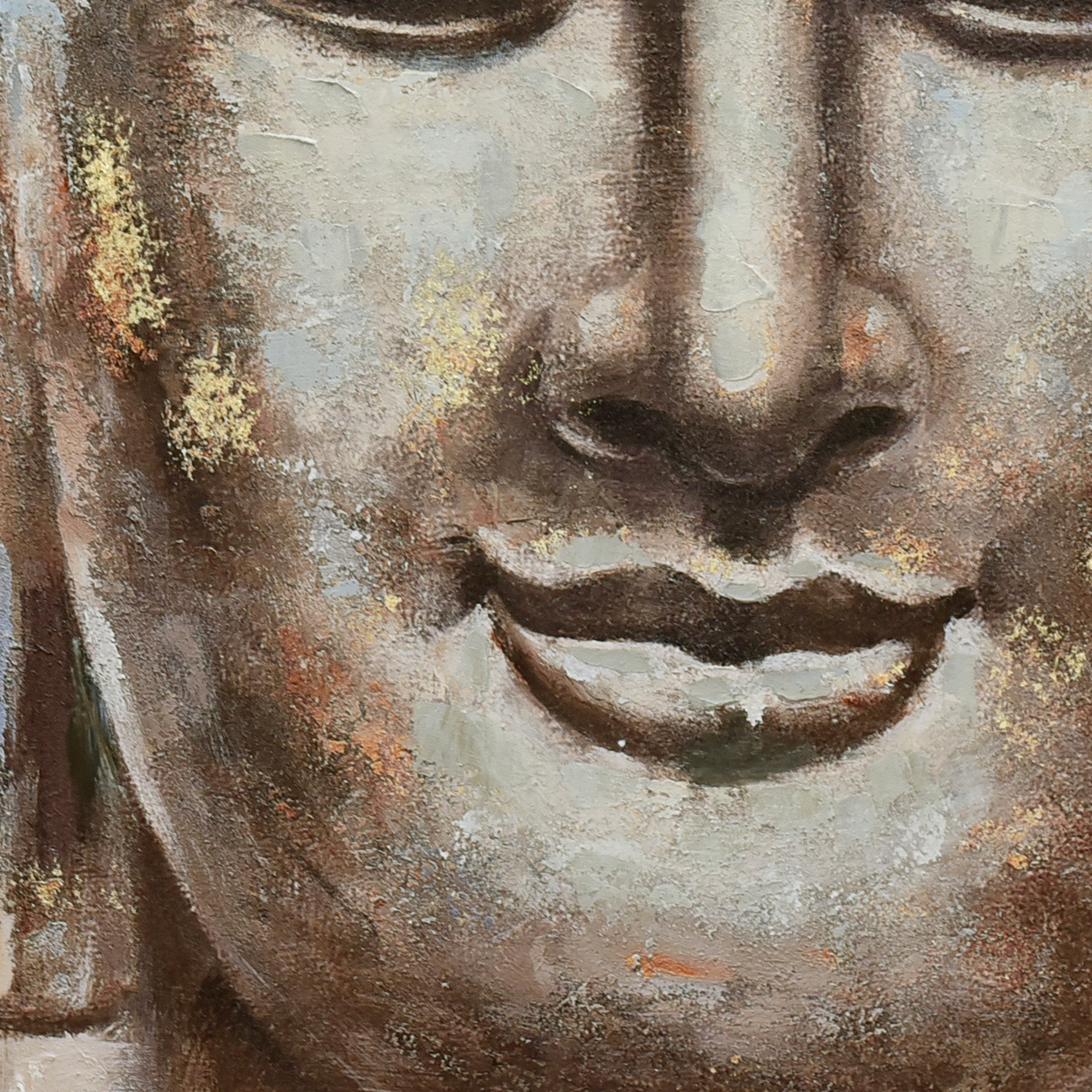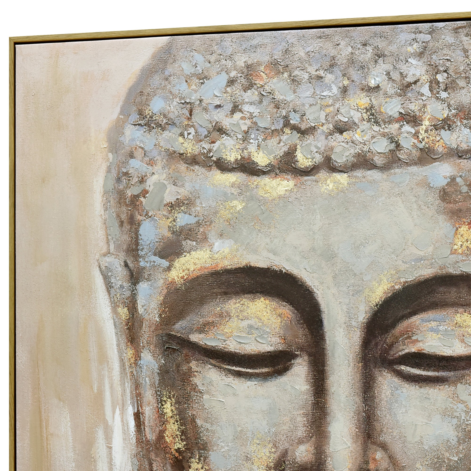 This wall art features a Buddha face rendered in earthy tones with subtle gold highlights, framed in dark wood. It combines hand-painted and printed techniques to create a spiritual and peaceful ambiance, making it a meaningful addition to any space.