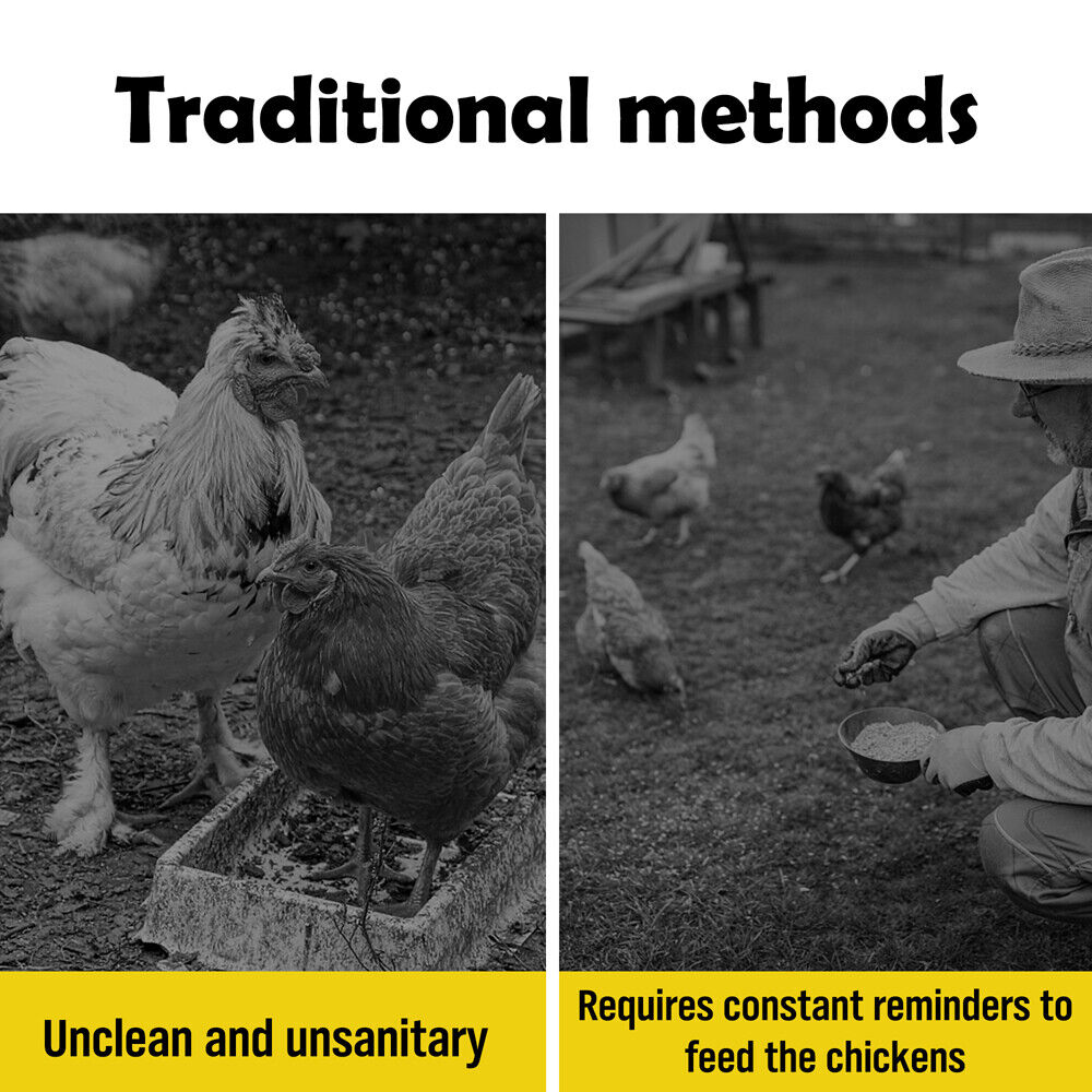 This automatic chicken feeder is designed to provide a convenient and hygienic way to feed backyard chickens. Made from rust-proof steel, it features a weight-operated lid that opens when chickens of at least 500 grams step onto the platform, ensuring they can access food anytime while preventing pests from stealing feed. The feeder is waterproof, keeping the feed clean and fresh, and is easy to assemble and maintain with a protective coating that can be polished off.