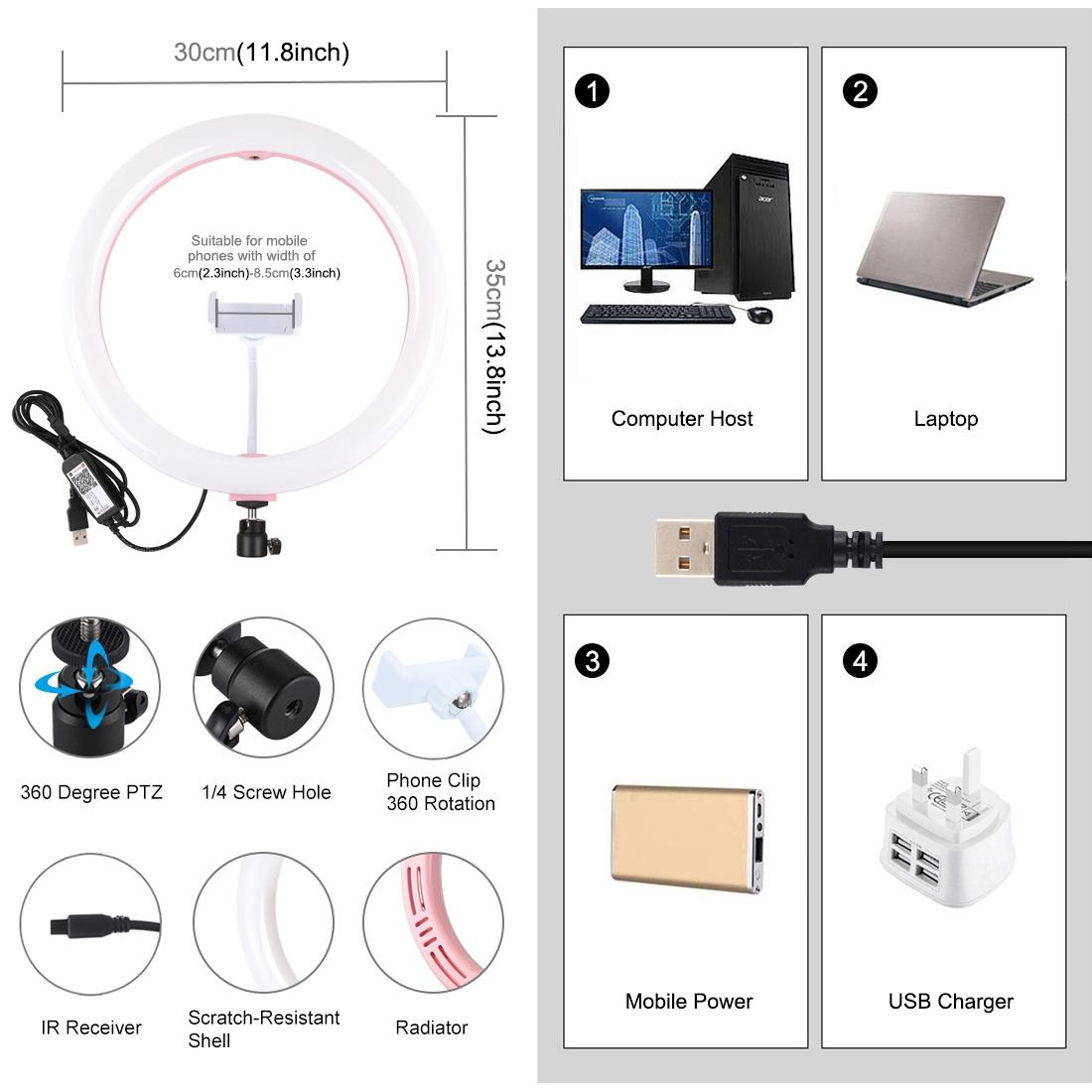 This 11.8-inch dual-temperature LED ring light is designed for versatile photography and videography. It features a 360-degree rotating tripod ball head for adjustable angles, making it suitable for various shooting setups. The light is equipped with energy-efficient LED beads that provide high color rendering and excellent heat dissipation, enhancing skin tones in portraits. It offers adjustable RGB colors and brightness levels, allowing for creative lighting effects without additional filters. The lightweight and portable design makes it ideal for both outdoor and indoor use. A phone clamp accommodates devices 6-8.5cm wide, and Bluetooth wireless control enables easy operation of different lighting modes and functions. The power supply is via USB with a voltage of 5V/2.5A.