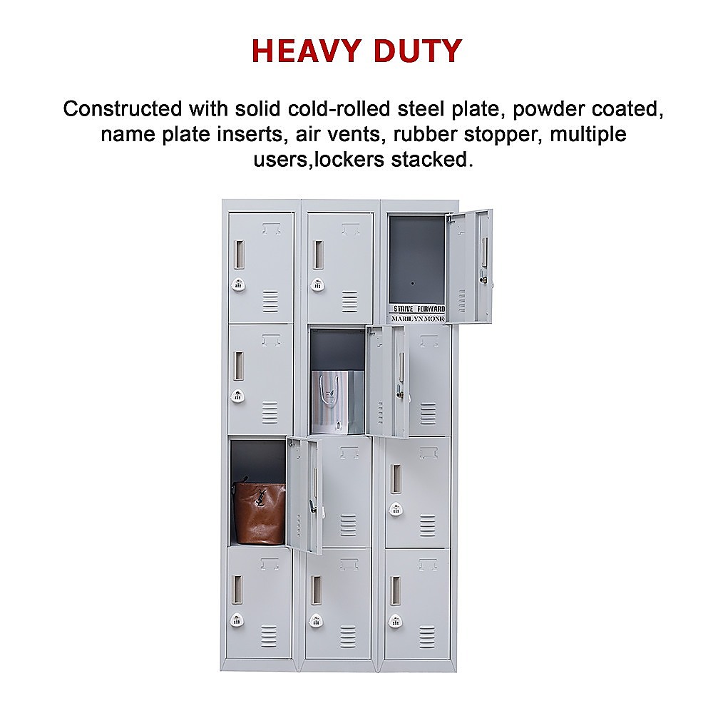 This 12-door locker provides a secure and organized storage solution suitable for various environments such as offices, gyms, schools, and homes. It features multiple compartments with individual locks, offering privacy and safety for personal belongings. The sturdy construction and simple assembly make it a practical choice for multiple users.