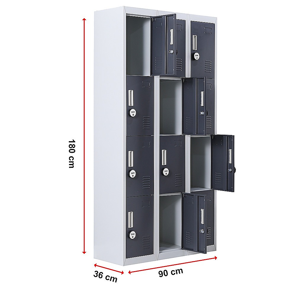 This 12-door locker unit offers a secure and organized storage solution suitable for various environments such as offices, gyms, schools, and homes. It features multiple compartments with ample space, ventilation, and customizable labels, all secured with a 4-digit combination lock for added safety.