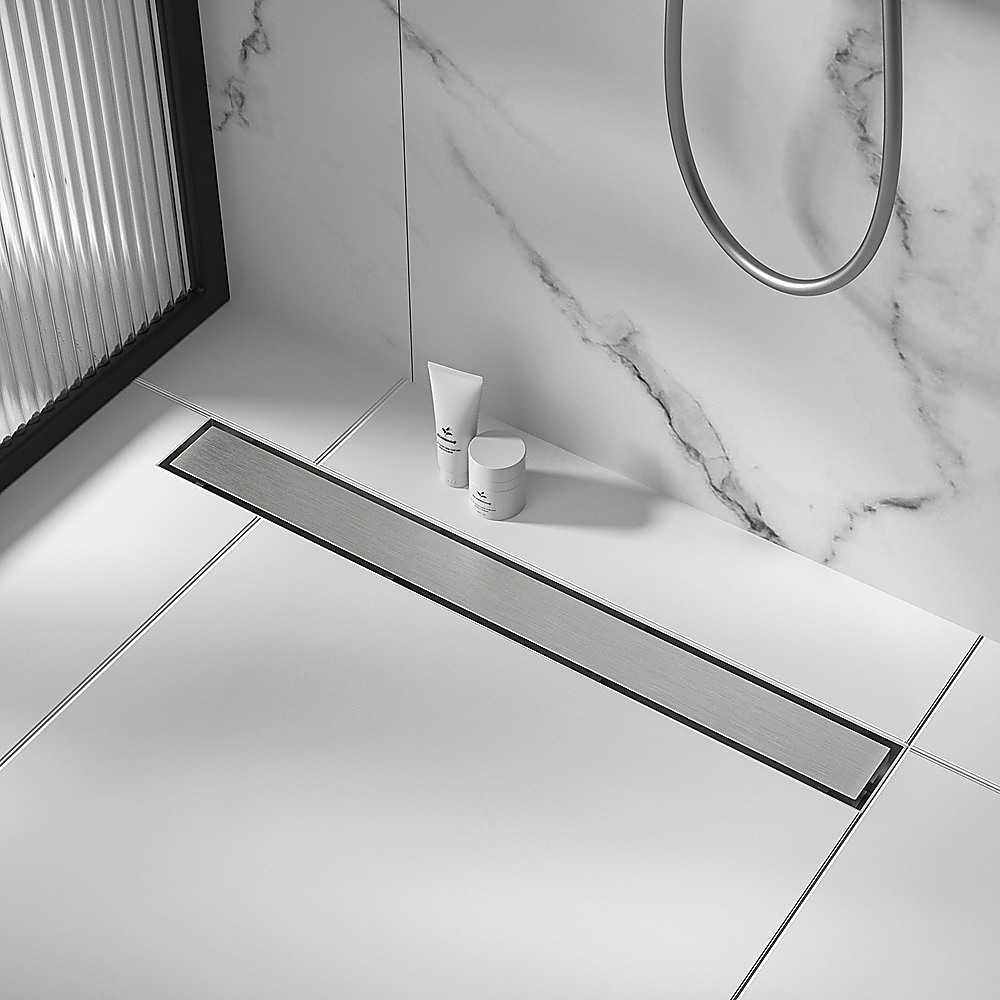 This stainless steel shower grate combines a sleek design with durability, making it an ideal addition to any bathroom renovation. Its frameless tile-insert style allows for seamless integration into the shower floor, providing both functionality and aesthetic appeal. Constructed from high-quality materials, it offers long-lasting performance and resistance to corrosion.