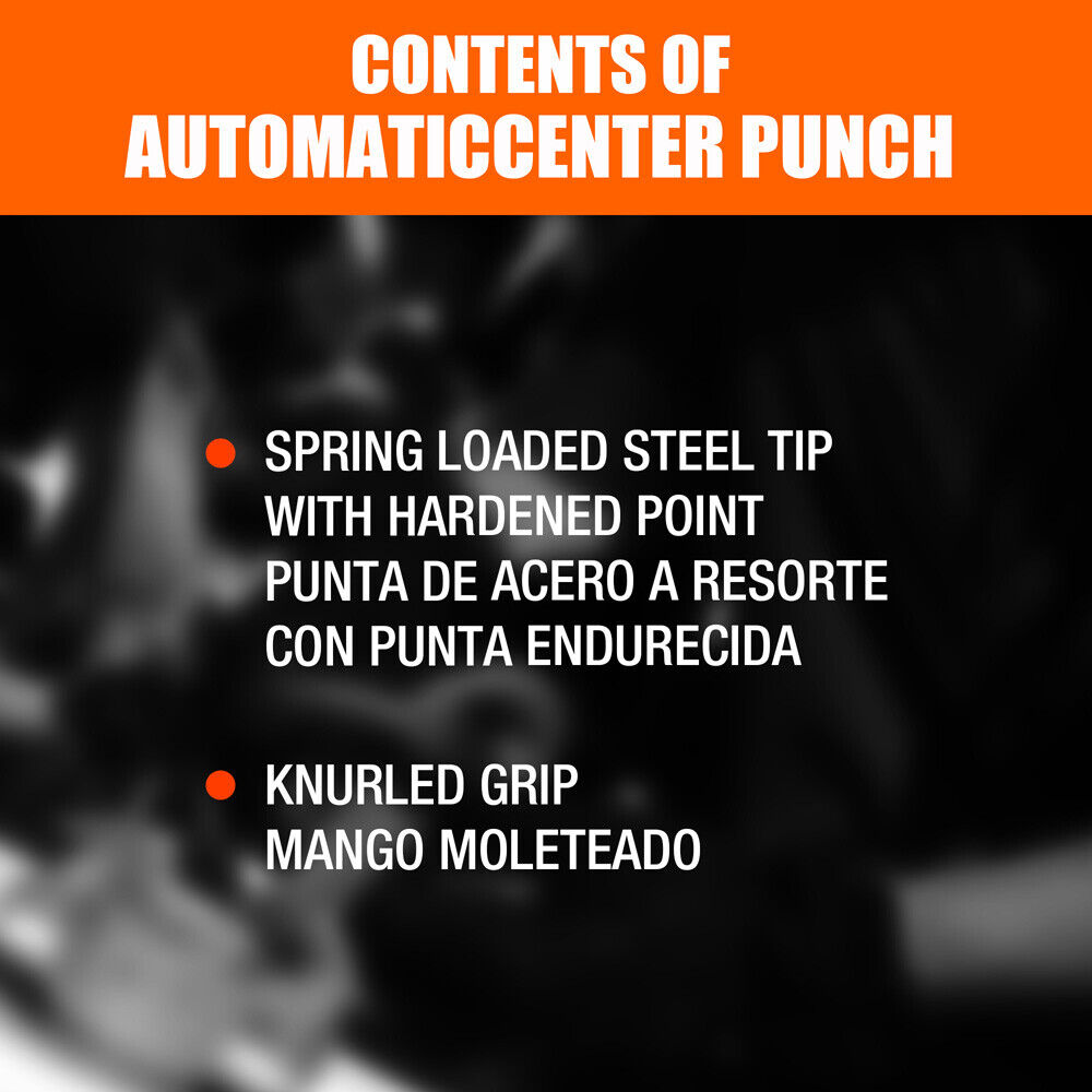 This automatic centre punch is designed for precise marking on metal and other solid materials. It features an adjustable spring mechanism that allows for easy operation and accurate starting points, helping to prevent slipping during drilling. The tool is suitable for use with one hand, making your work more efficient and safer.