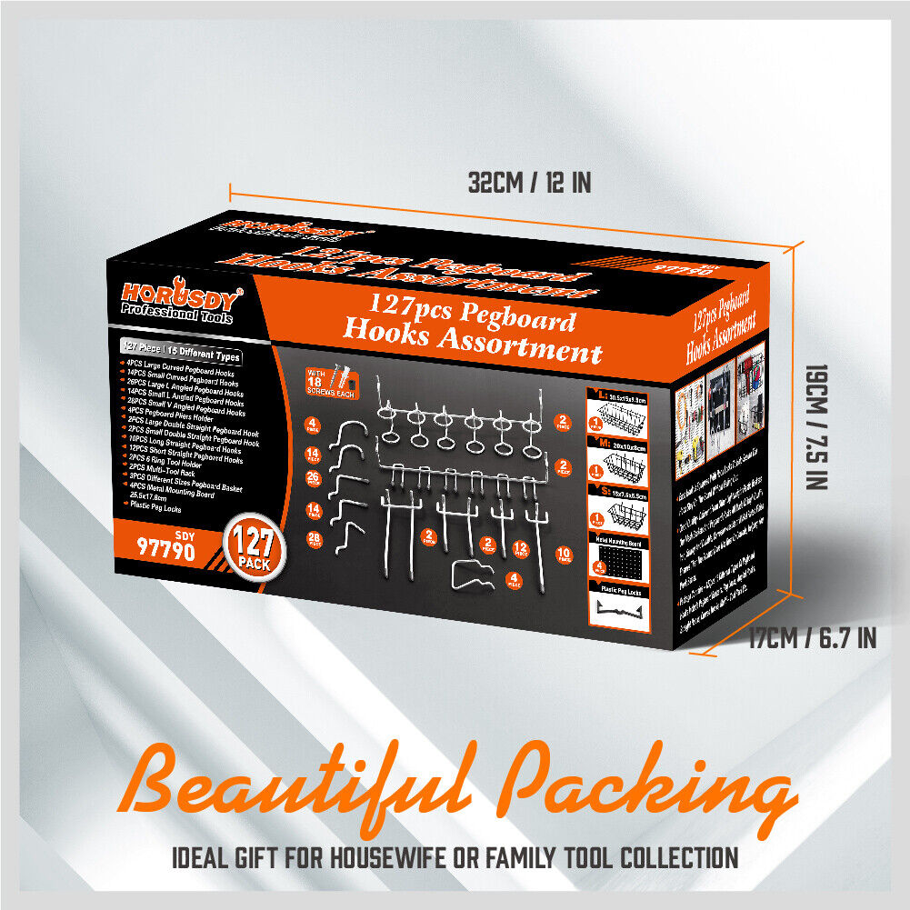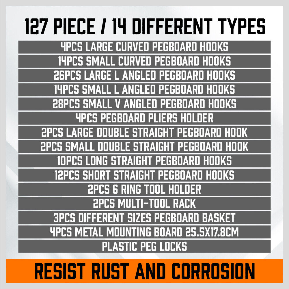 This 127-piece pegboard hooks set provides a comprehensive storage solution for organizing tools, accessories, and equipment. Compatible with 1/8 inch and 1/4 inch pegboards, it offers versatile hanging options to keep your space tidy and accessible.