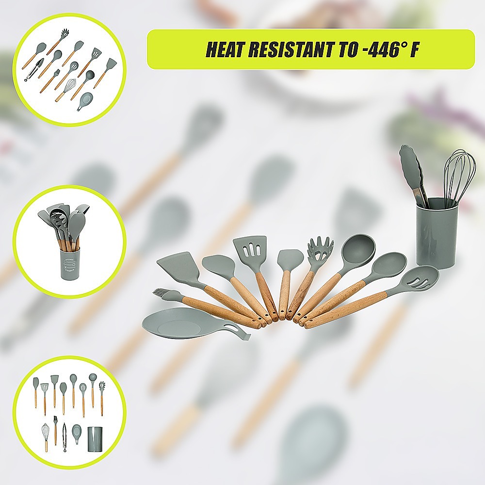 This 13-piece silicone kitchen utensil set is designed to enhance your cooking and baking experience. Featuring a sleek combination of natural wood tones and grey silicone, these utensils are both functional and stylish. They are easy to store, thanks to built-in hooks, and are suitable for everyday use in any kitchen environment.