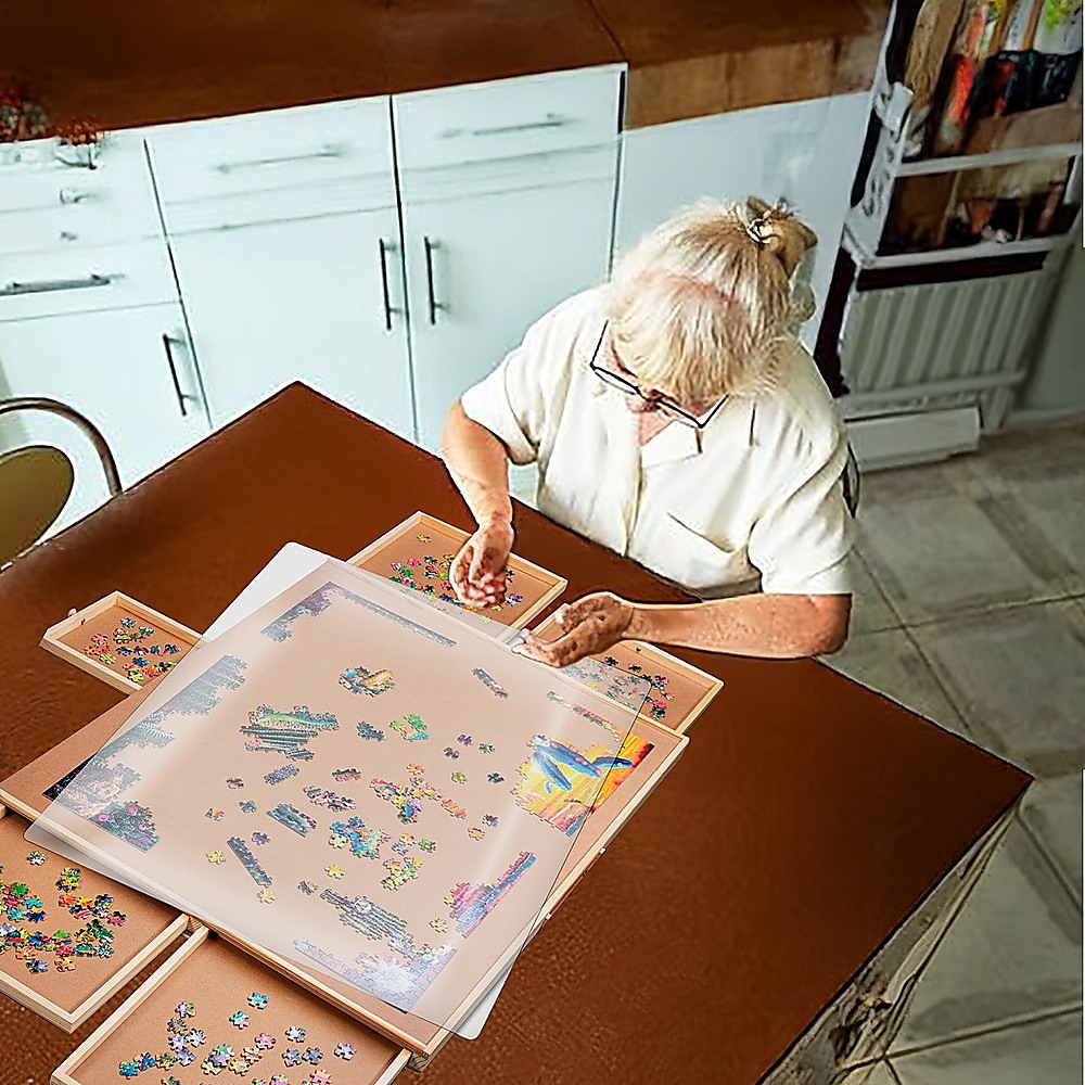 This rotating wooden jigsaw puzzle table features six drawers and a smooth, 360-degree rotating surface designed to enhance your puzzle-solving experience. Its thoughtful design allows easy access to all parts of your puzzle, making assembly more comfortable and efficient. The table also includes a protective cover to keep your puzzle secure during breaks or accidental disturbances, providing a tidy and organized workspace.