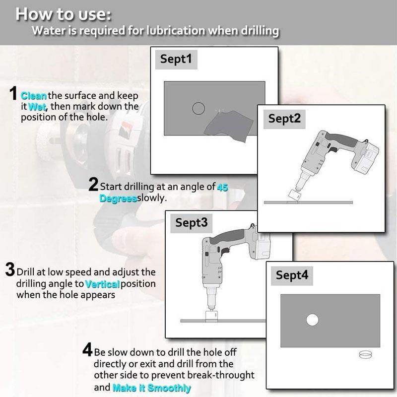 - Ideal for drilling holes in glass, tiles, bottles, blocks, jars, fiberglass, porcelain, ceramics, slate, marble, and light stone.