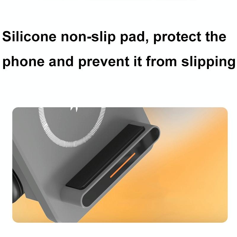 This multifunctional wireless charger combines practicality and innovative design, allowing you to charge multiple devices simultaneously. It features a car-inspired aesthetic with intelligent current matching, automatic power output adjustment, and dual coil technology for both horizontal and vertical charging. The charger is equipped with sensitive induction for case-friendly charging and adjustable atmosphere taillights for a soft glow. Anti-skid wheels and silicone pads ensure safety and device protection during use.