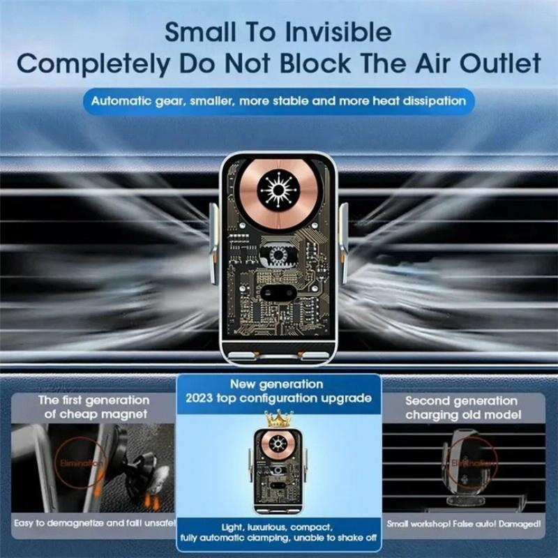 This wireless charger combines fast charging with a phone holder, designed for use in vehicles. It features an infrared sensor for one-handed operation, automatic opening and clamping for safety, and a quick-release button for easy adjustment. The device supports cable-free charging through a compatible phone case and can be securely mounted on various surfaces with strong suction cups. Its adjustable viewing angle allows for 360-degree rotation, providing a flexible and convenient user experience.