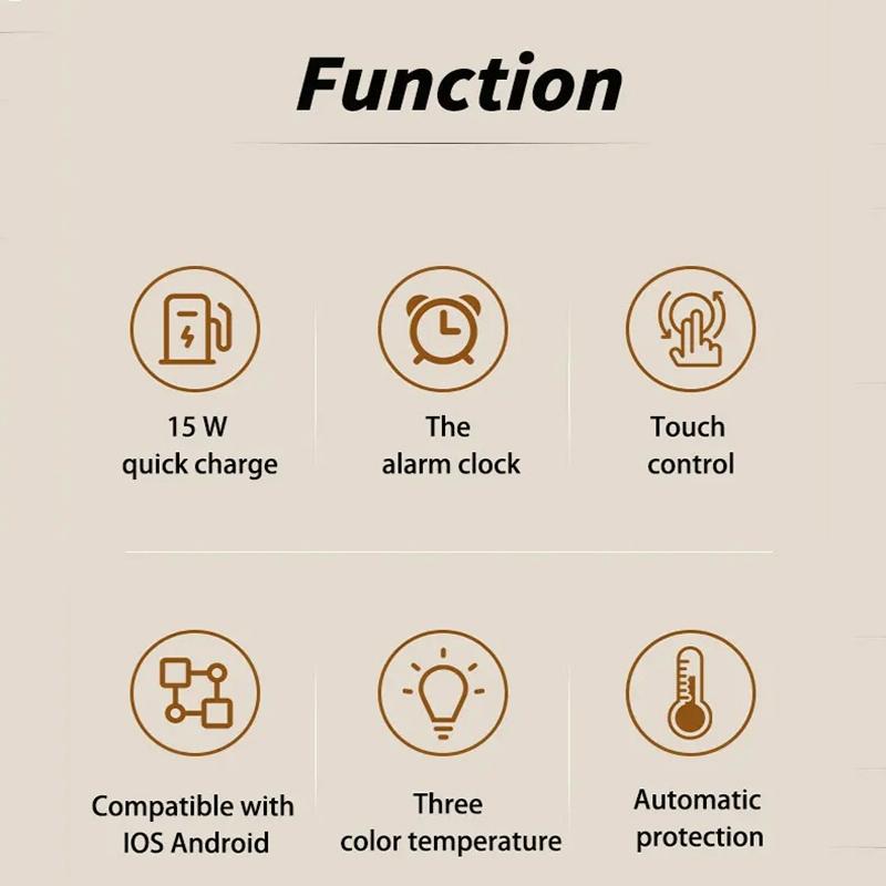 This 15W rotatable night light fast charger combines efficient wireless charging with adjustable lighting, providing a safe and convenient power solution for your devices. It features multiple protection functions, adjustable brightness levels, and a stable silicone base for enhanced safety and usability.